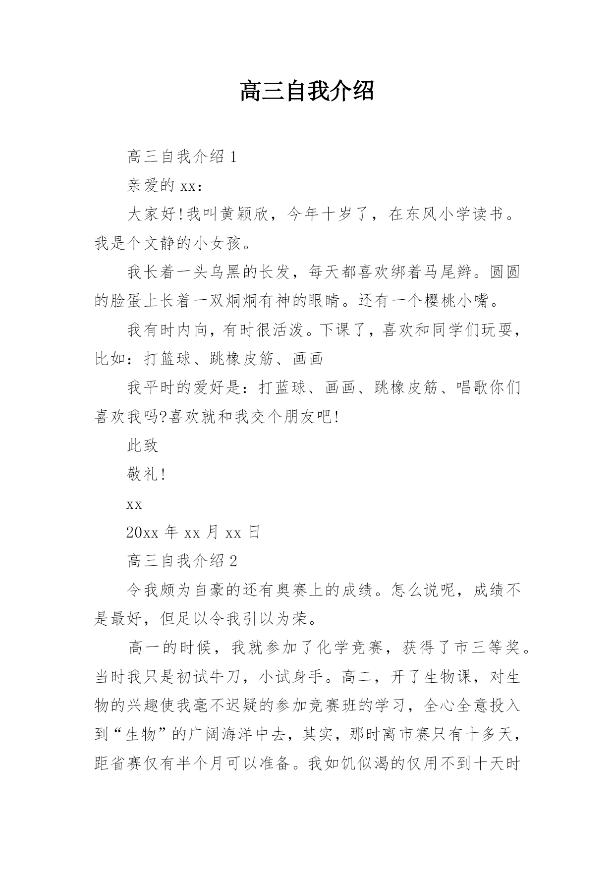 高三自我介绍高三自我介绍1亲爱的xx:大家好!我叫黄颖欣,今年十岁了,在东风小学读书。我是个文静的小女孩。我长着一头乌黑的长发,每天都喜欢绑着马尾辫。圆圆的脸蛋上长着一双烔烔有神的眼睛。还有一个樱桃小嘴。我有时内向,有时很活泼。下课了,喜欢和同学们玩耍,比如:打篮球、跳橡皮筋、画画我平时的爱好是:打蓝球、画画、跳橡皮筋、唱歌你们喜欢我吗?喜欢就和我交个朋友吧!此致敬礼!xx20xx年xx月xx日高三自我介绍2令我颇为自豪的还有奥赛上的成绩。怎么说呢,成绩不是最好,但足以令我引以为荣。高一的时候,我就参加了