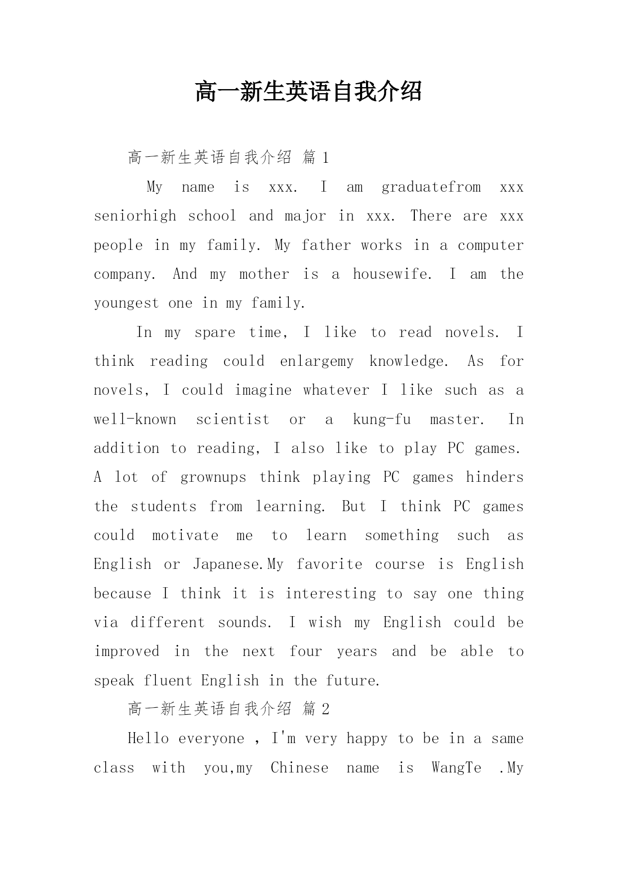 高一新生英语自我介绍高一新生英语自我介绍篇1Mynameisxxx.Iamgraduatefromxxxseniorhighschoolandmajorinxxx.Therearexxxpeopleinmyfamily.Myfatherworksinacomputercompany.Andmymotherisahousewife.Iamtheyoungestoneinmyfamily.Inmysparetime,Iliketoreadnovels.Ithinkreadingcouldenlargemykn