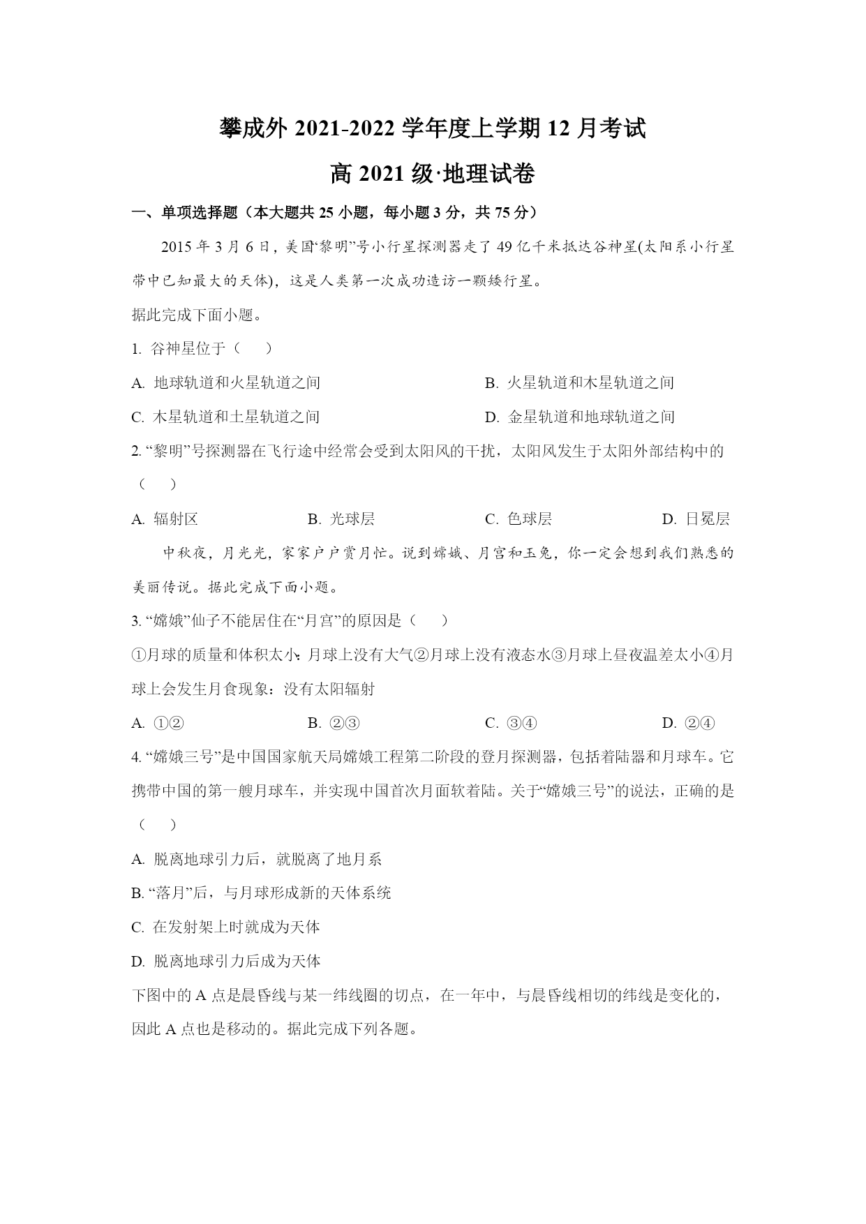 攀成外2021-2022学年度上学期12月考试高2021级·地理试卷一、单项选择题(本大题共25小题,每小题3分,共75分)2015年3月6日,美国“黎明”号小行星探测器走了49亿千米抵达谷神星(太阳系小行星带中已知最大的天体),这是人类第一次成功造访一颗矮行星。据此完成下面小题。1.谷神星位于()A.地球轨道和火星轨道之间B.火星轨道和木星轨道之间C.木星轨道和土星轨道之间D.金星轨道和地球轨道之间2.“黎明”号探测器在飞行途中经常会受到太阳风的干扰,太阳风发生于太阳外部结构中的()A.辐射区B.光球层
