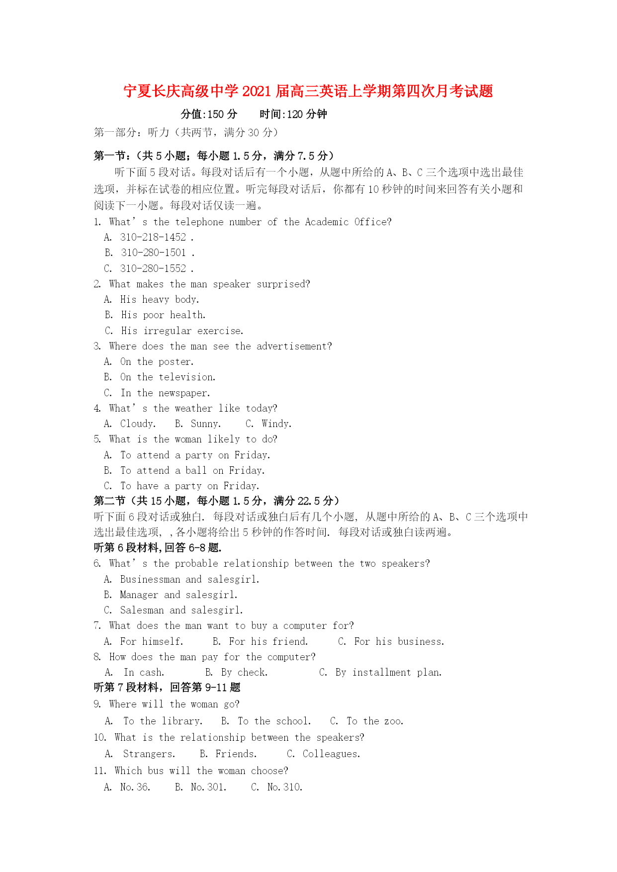 宁夏长庆高级中学2021届高三英语上学期第四次月考试题分值:150分时间:120分钟第一部分:听力(共两节,满分30分)第一节:(共5小题;每小题1.5分,满分7.5分)听下面5段对话。每段对话后有一个小题,从题中所给的A、B、C三个选项中选出最佳选项,并标在试卷的相应位置。听完每段对话后,你都有10秒钟的时间来回答有关小题和阅读下一小题。每段对话仅读一遍。What’sthetelephonenumberoftheAcademicOffice?A.310-218-1452.B.310-280-1501.C