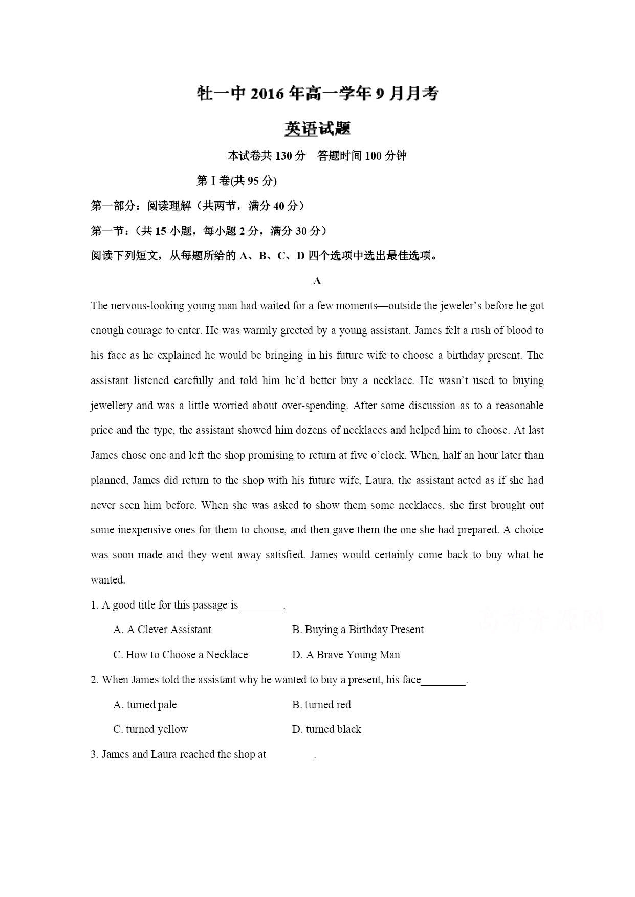 本试卷共130分答题时间100分钟第Ⅰ卷(共95分)第一部分:阅读理解(共两节,满分40分)第一节:(共15小题,每小题2分,满分30分)阅读下列短文,从每题所给的A、B、C、D四个选项中选出最佳选项。AThenervous-lookingyoungmanhadwaitedforafewmoments—outsidethejeweler’sbeforehegotenoughcouragetoenter.Hewaswarmlygreetedbyayoungassistant.Jamesfeltarushof