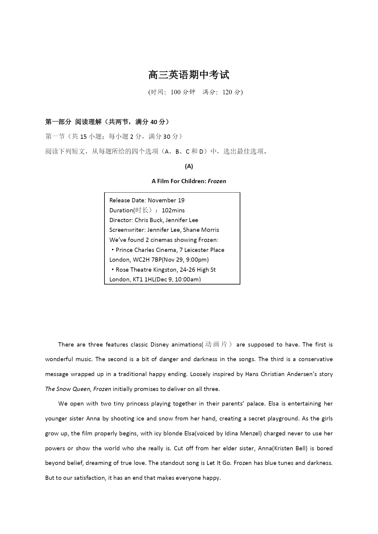 高三英语期中考试(时间:100分钟满分:120分)第一部分阅读理解(共两节,满分40分)(共15小题;每小题2分,满分30分)阅读下列短文,从每题所给的四个选项(A、B、C和D)中,选出最佳选项。(A)AFilmForChildren:FrozenReleaseDate:November19Duration(时长):102minsDirector:ChrisBuck,JenniferLeeScreenwriter:JenniferLee,ShaneMorrisWe’vefound2cinemasshowi