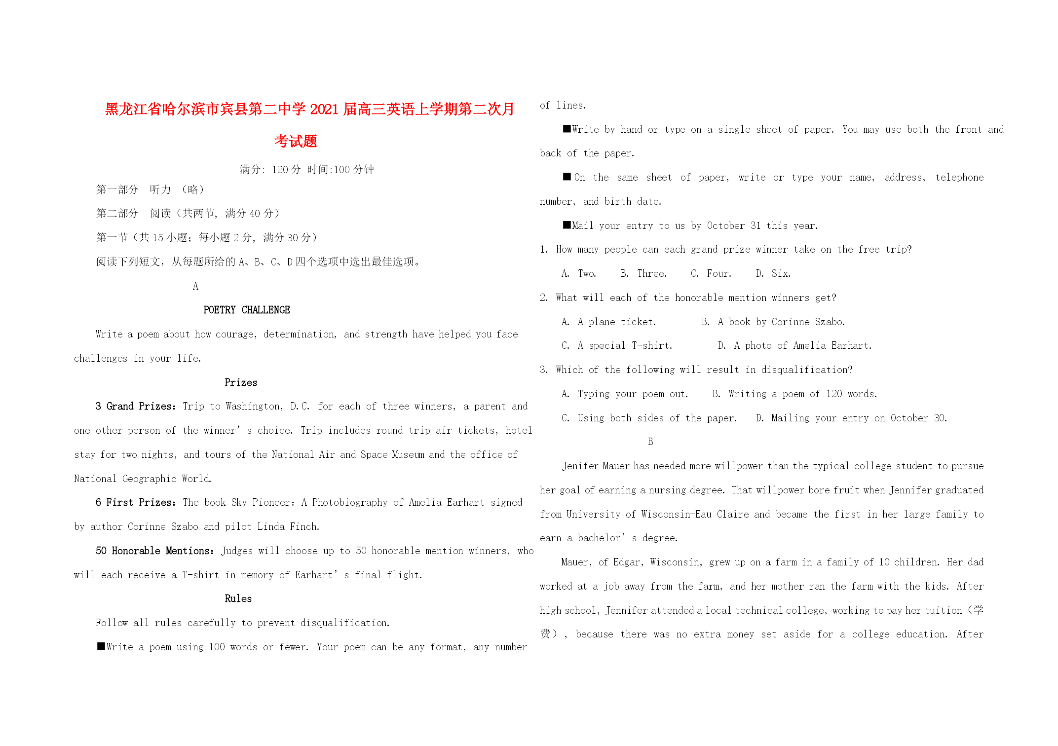 黑龙江省哈尔滨市宾县第二中学2021届高三英语上学期第二次月考试题满分:120分时间:100分钟听力(略)阅读(共两节,满分40分)第一节(共15小题;每小题2分,满分30分)阅读下列短文,从每题所给的A、B、C、D四个选项中选出最佳选项。APOETRYCHALLENGEWriteapoemabouthowcourage,determination,andstrengthhavehelpedyoufacechallengesinyourlife.Prizes3GrandPrizes:TriptoWashi