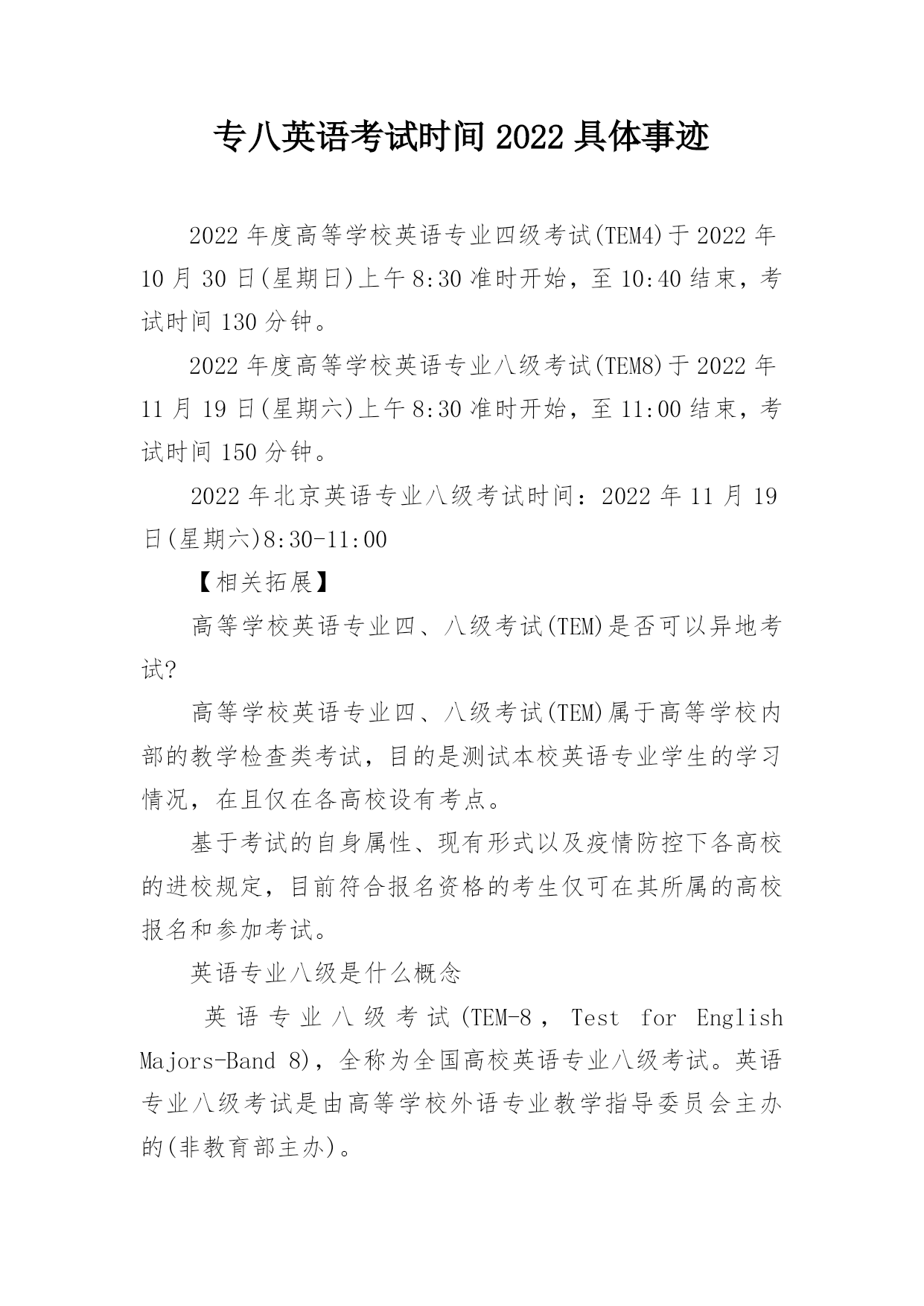 专八英语考试时间2022具体事迹2022年度高等学校英语专业四级考试(TEM4)于2022年10月30日(星期日)上午8:30准时开始,至10:40结束,考试时间130分钟。2022年度高等学校英语专业八级考试(TEM8)于2022年11月19日(星期六)上午8:30准时开始,至11:00结束,考试时间150分钟。2022年北京英语专业八级考试时间:2022年11月19日(星期六)8:30-11:00【相关拓展】高等学校英语专业四、八级考试(TEM)是否可以异地考试?高等学校英语专业四、八级考试(TEM)