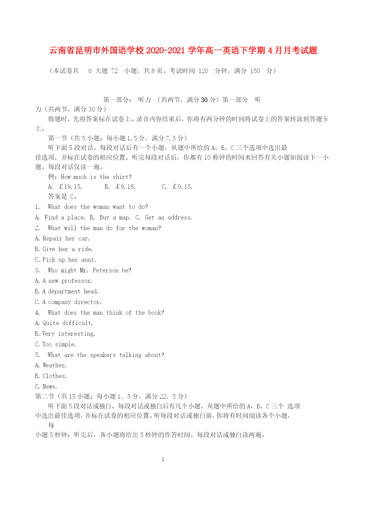 云南省昆明市外国语学校2020-2021学年高一英语下学期4月月考试题(本试卷共6大题72小题,。考试时间120分钟,满分150分)第一部分:听力(共两节,满分30分)第一部分听力(共两节,满分30分)做题时,先将答案标在试卷上。录音内容结束后,你将有两分钟的时间将试卷上的答案转涂到答题卡上。第一节(共5小题;每小题1.5分,满分7.5分)听下面5段对话。每段对话后有一个小题,从题中所给的A、B、C三个选项中选出最佳选项,并标在试卷的相应位置。听完每段对话后,你都有10称钟的时间来回答有关小题如阅读下一小