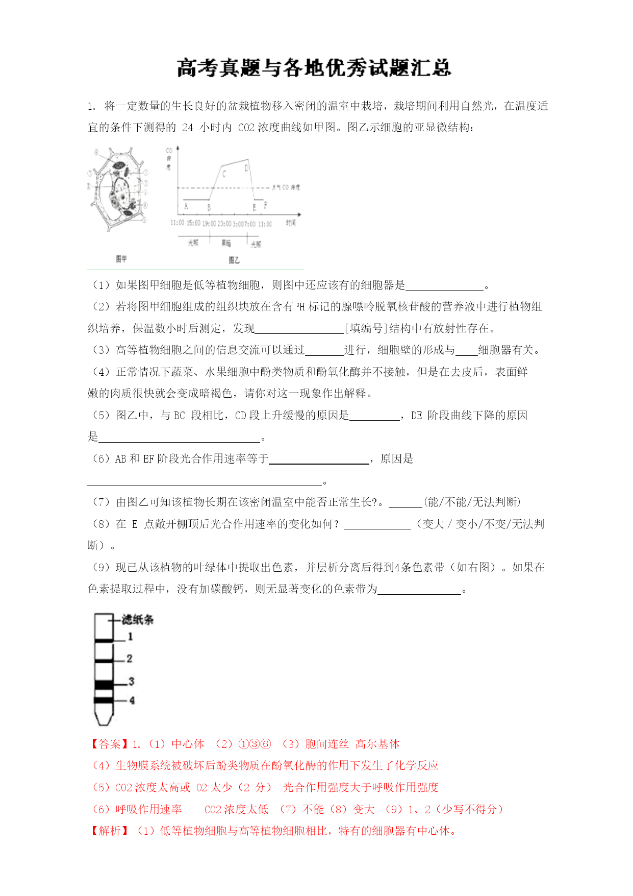 1.将一定数量的生长良好的盆栽植物移入密闭的温室中栽培,栽培期间利用自然光,在温度适宜的条件下测得的24小时内CO2浓度曲线如甲图。图乙示细胞的亚显微结构:(1)如果图甲细胞是低等植物细胞,则图中还应该有的细胞器是______________。(2)若将图甲细胞组成的组织块放在含有3H标记的腺嘌呤脱氧核苷酸的营养液中进行植物组织培养,保温数小时后测定,发现[填编号]结构中有放射性存在。(3)高等植物细胞之间的信息交流可以通过进行,细胞壁的形成与细胞器有关。(4)正常情况下蔬菜、水果细胞中酚类物质和酚氧化酶
