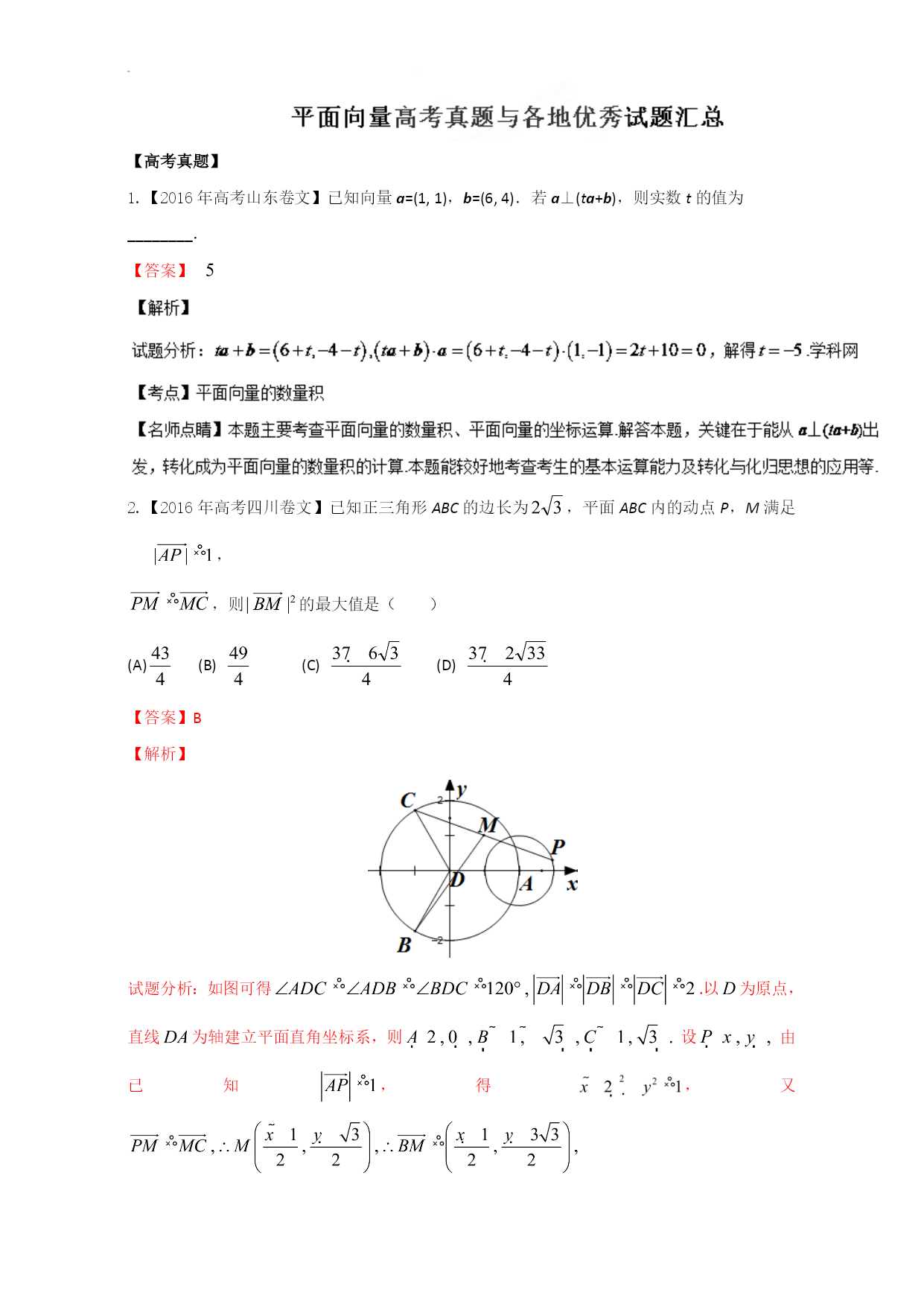 【高考真题】1.【2016年高考山东卷文】已知向量a=(1,1),b=(6,4).若a⊥(ta+b),则实数t的值为________.【答案】2.【2016年高考四川卷文】已知正三角形ABC的边长为,平面ABC内的动点P,M满足,,则的最大值是()(A)(B)(C)(D)【答案】B【解析】试题分析:如图可得.以为原点,直线为轴建立平面直角坐标系,则设由已知,得,又,它表示圆上的点与点的距离的平方的,,故选B.【考点】向量的夹角,解析几何中与圆有关的最值问题【名师点睛】本题考查平面向量的夹角与向量的模,由于