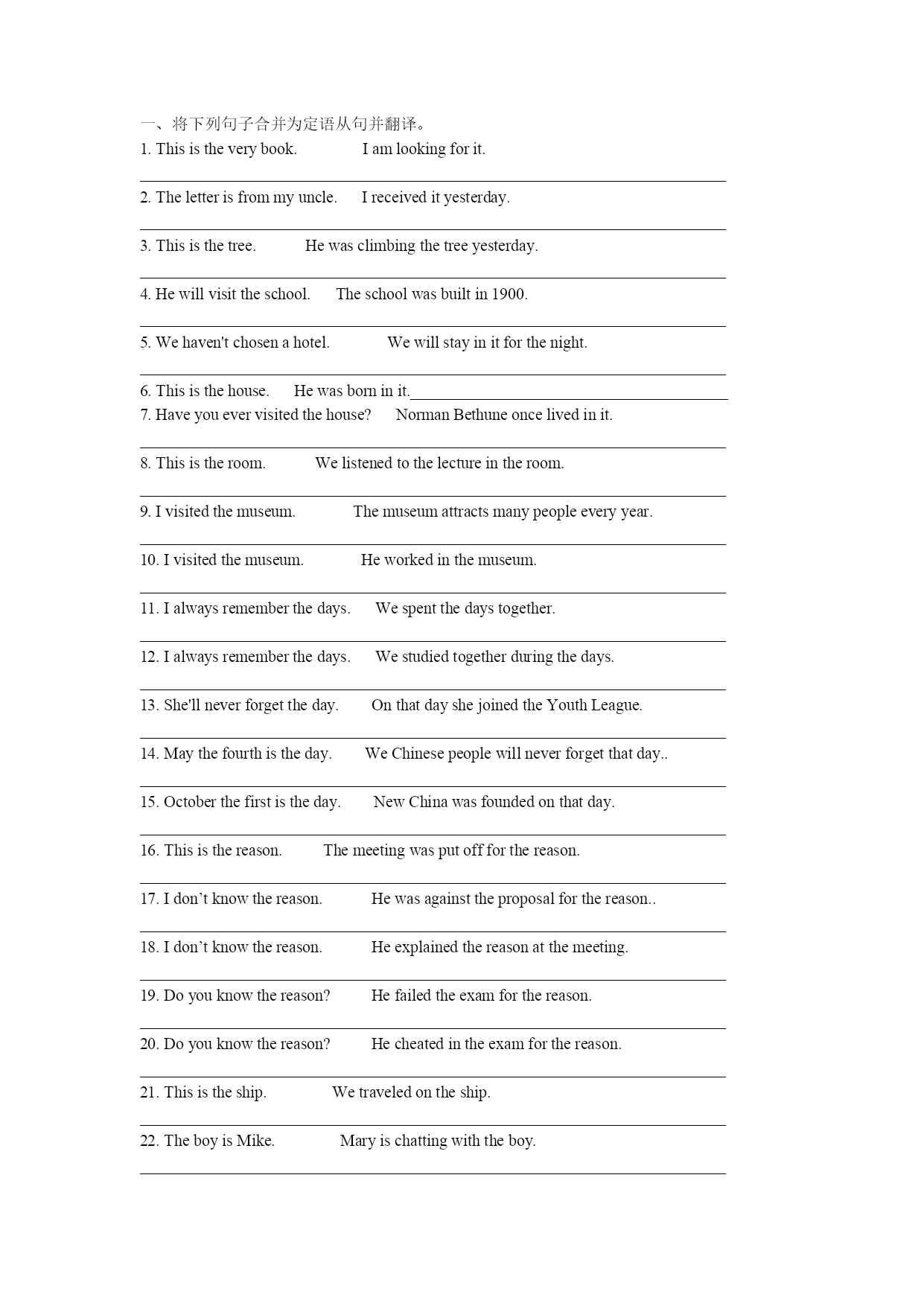 一、将下列句子合并为定语从句并翻译。1.Thisistheverybook.Iamlookingforit.________________________________________________________________________2.Theletterisfrommyuncle.Ireceivedityesterday.________________________________________________________________________3.Thisisthe