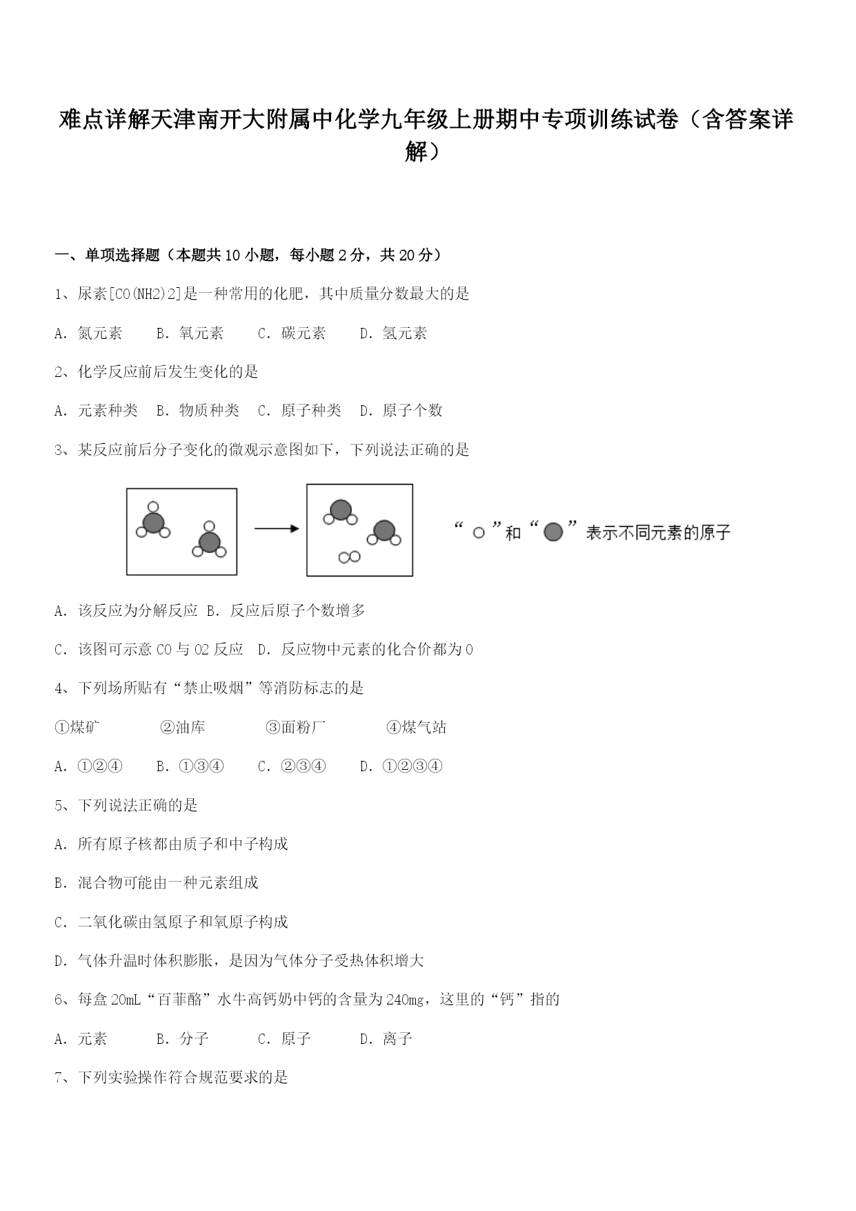 难点详解天津南开大附属中化学九年级上册期中专项训练试卷(含答案详解)一、单项选择题(本题共10小题,每小题2分,共20分)1、尿素[CO(NH2)2]是一种常用的化肥,其中质量分数最大的是A.氮元素B.氧元素C.碳元素D.氢元素2、化学反应前后发生变化的是A.元素种类B.物质种类C.原子种类D.原子个数3、某反应前后分子变化的微观示意图如下,下列说法正确的是A.该反应为分解反应B.反应后原子个数增多C.该图可示意CO与O2反应D.反应物中元素的化合价都为04、下列场所贴有“禁止吸烟”等消防标志的是①煤矿②