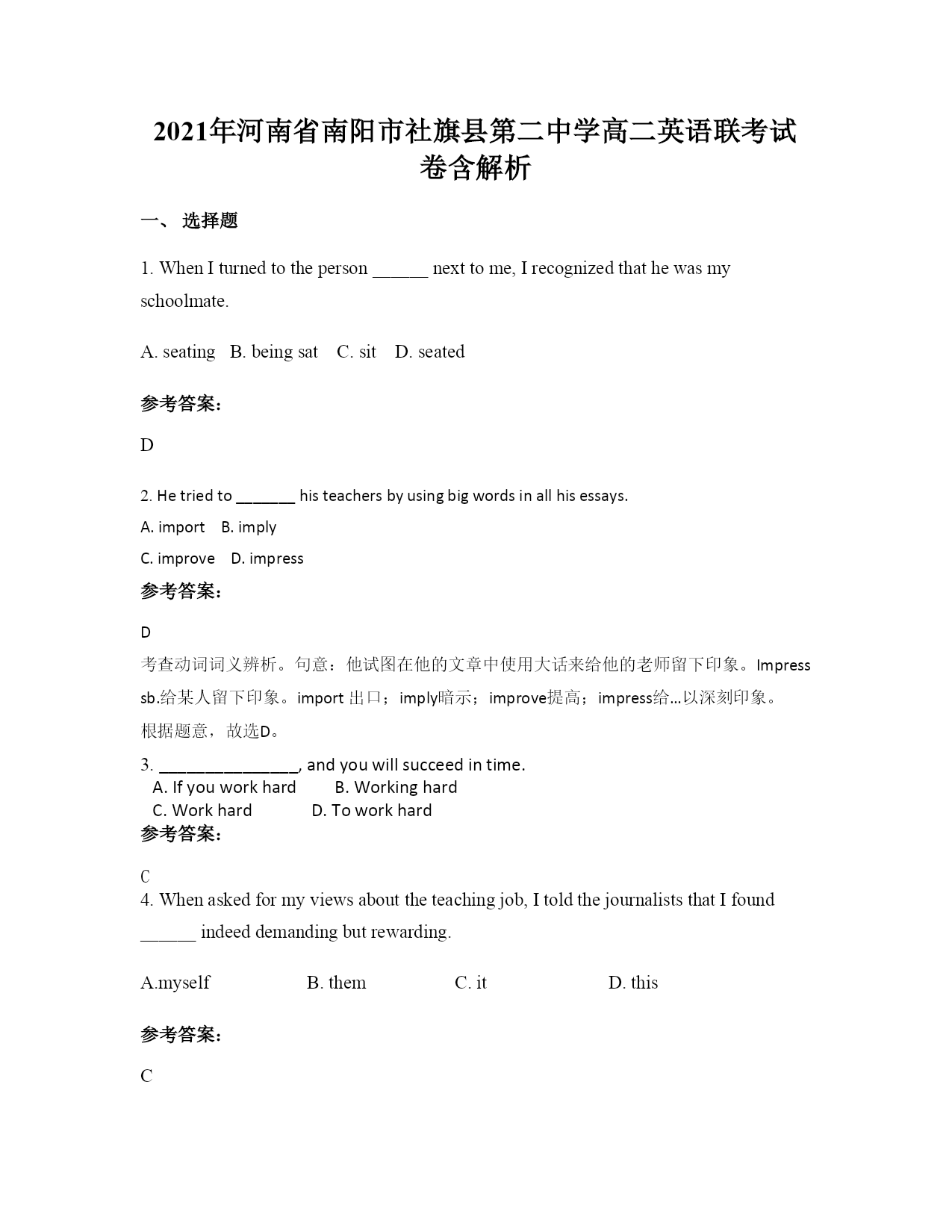 2021年河南省南阳市社旗县第二中学高二英语联考试卷含解析一、选择题1.WhenIturnedtotheperson______nexttome,Irecognizedthathewasmyschoolmate.A.seatingB.beingsatC.sitD.seated参考答案:D2.Hetriedto_______histeachersbyusingbigwordsinallhisessays.A.importB.implyC.improveD.impress参考答案:D考查动词词义辨析。句意:他