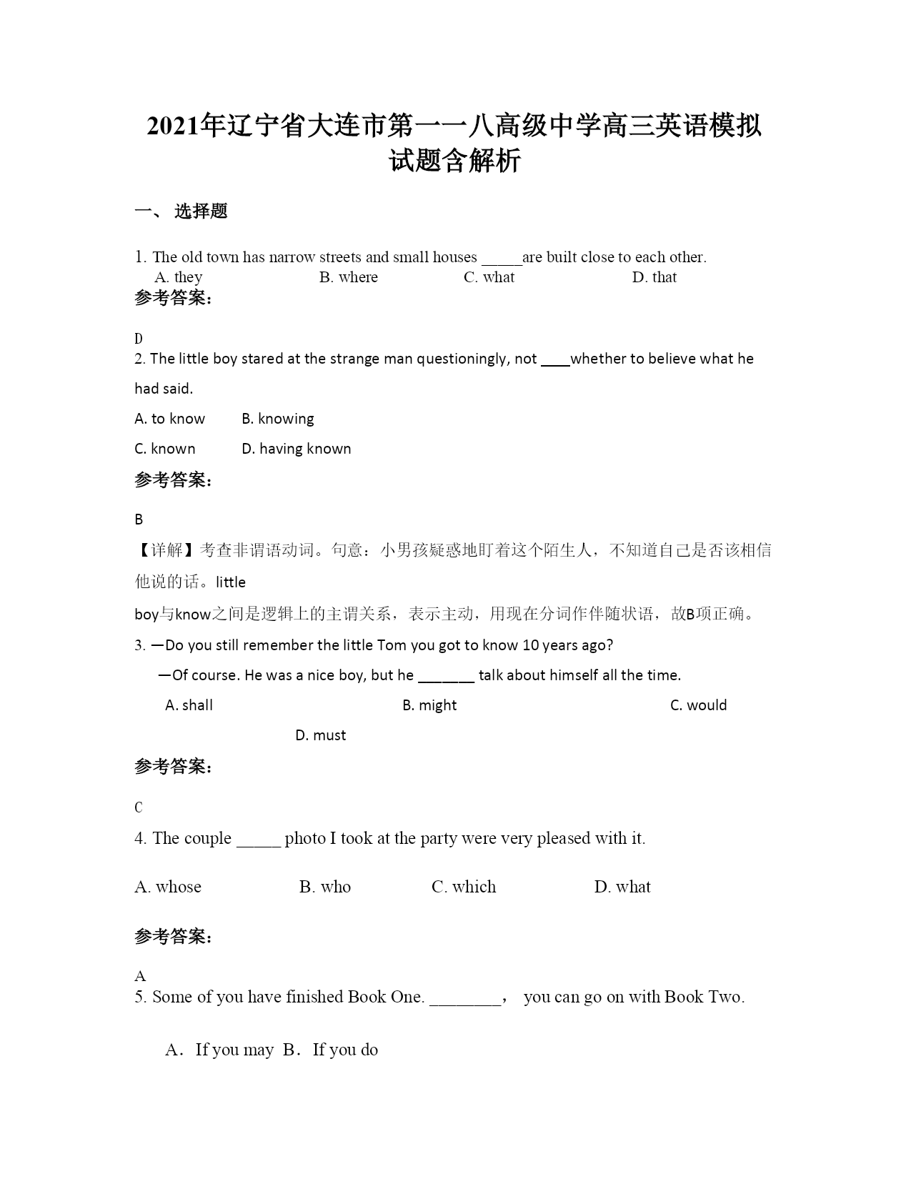2021年辽宁省大连市第一一八高级中学高三英语模拟试题含解析一、选择题1.Theoldtownhasnarrowstreetsandsmallhouses_____arebuiltclosetoeachother.A.theyB.whereC.whatD.that参考答案:D2.Thelittleboystaredatthestrangemanquestioningly,notwhethertobelievewhathehadsaid.A.toknowB.knowingC.knownD.havingkno