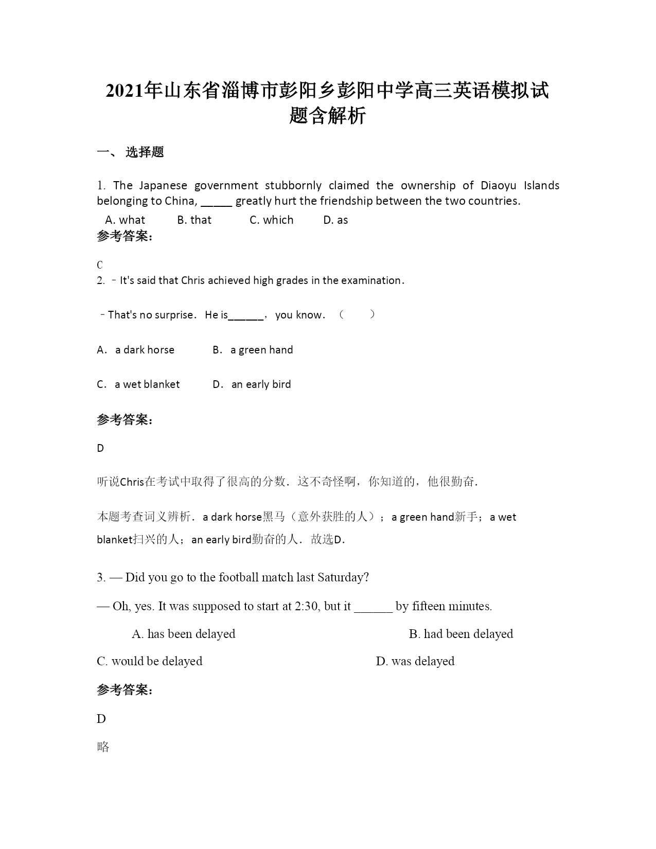 2021年山东省淄博市彭阳乡彭阳中学高三英语模拟试题含解析一、选择题1.TheJapanesegovernmentstubbornlyclaimedtheownershipofDiaoyuIslandsbelongingtoChina,_____greatlyhurtthefriendshipbetweenthetwocountries.A.whatB.thatC.whichD.as参考答案:C2.﹣It'ssaidthatChrisachievedhighgradesintheexamination.﹣