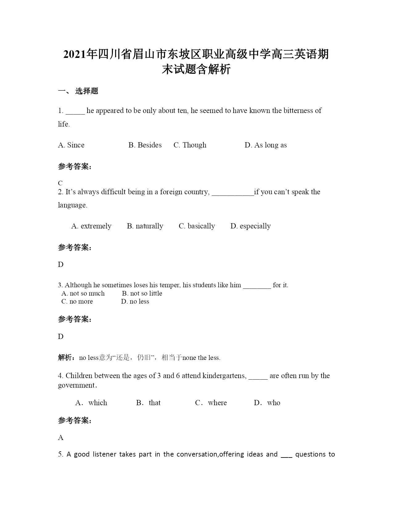 2021年四川省眉山市东坡区职业高级中学高三英语期末试题含解析一、选择题1._____heappearedtobeonlyaboutten,heseemedtohaveknownthebitternessoflife.A.SinceB.BesidesC.ThoughD.Aslongas参考答案:C2.It’salwaysdifficultbeinginaforeigncountry,___________ifyoucan’tspeakthelanguage.A.extremelyB.naturallyC.
