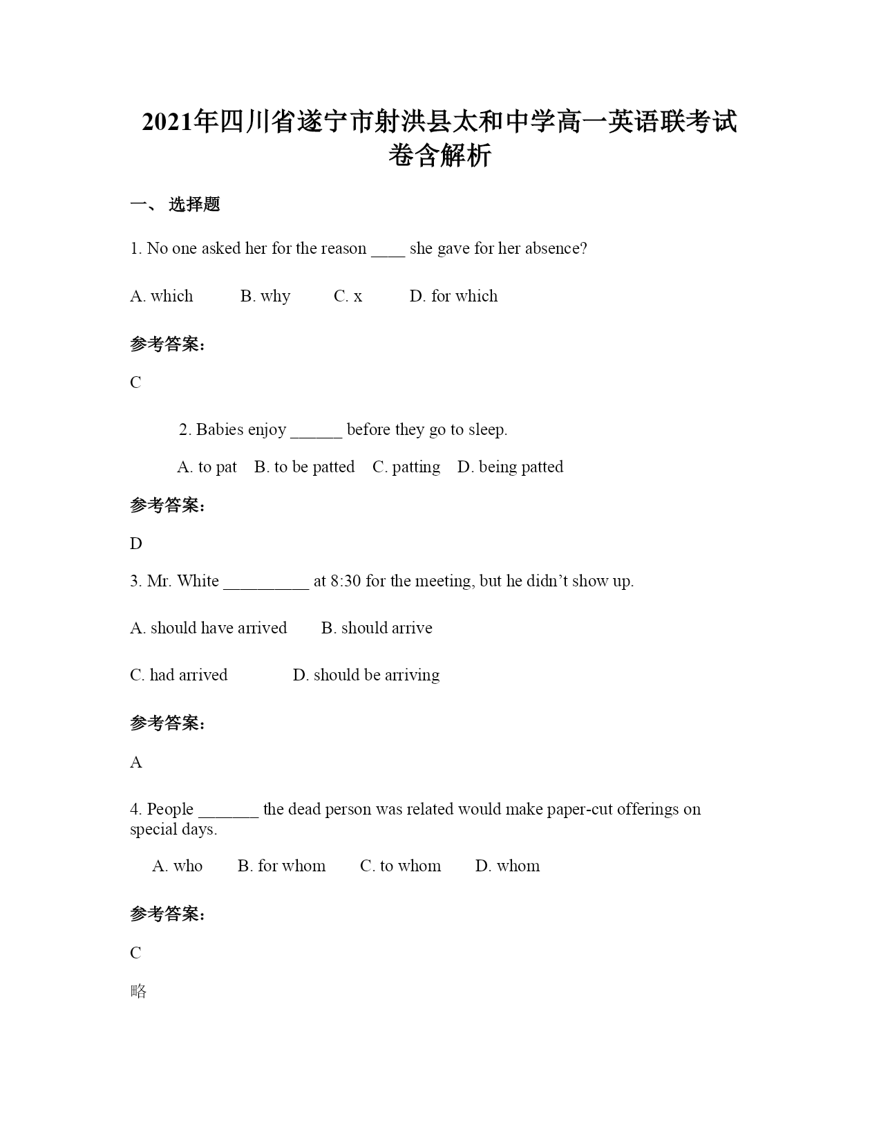 2021年四川省遂宁市射洪县太和中学高一英语联考试卷含解析一、选择题1.Nooneaskedherforthereason____shegaveforherabsence?A.whichB.whyC.xD.forwhich参考答案:C2.Babiesenjoy______beforetheygotosleep.A.topatB.tobepattedC.pattingD.beingpatted参考答案:D3.Mr.White__________at8:30forthemeeting,buthedidn’ts