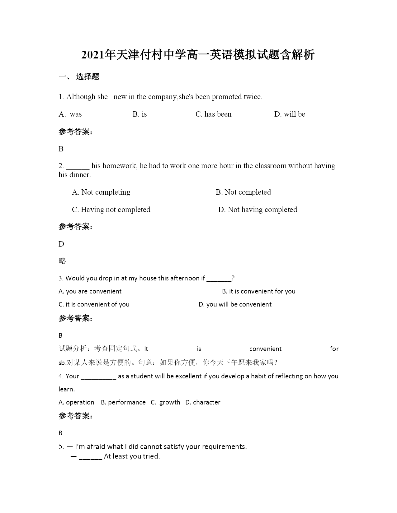 2021年天津付村中学高一英语模拟试题含解析一、选择题1.Althoughshenewinthecompany,she'sbeenpromotedtwice.A.wasB.isC.hasbeenD.willbe参考答案:B2.______hishomework,hehadtoworkonemorehourintheclassroomwithouthavinghisdinner.A.NotcompletingB.NotcompletedC.HavingnotcompletedD.Nothavingcompl