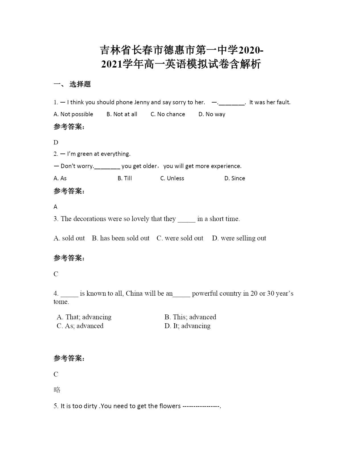 吉林省长春市德惠市第一中学2020-2021学年高一英语模拟试卷含解析一、选择题1.—IthinkyoushouldphoneJennyandsaysorrytoher.—.________.Itwasherfault.A.NotpossibleB.NotatallC.NochanceD.Noway参考答案:D2.—I’mgreenateverything.—Don’tworry.________yougetolder,youwillgetmoreexperience.A.AsB.TillC.Unless