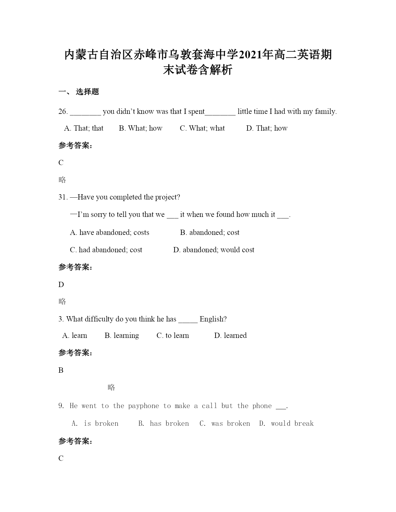 内蒙古自治区赤峰市乌敦套海中学2021年高二英语期末试卷含解析一、选择题26.________youdidn’tknowwasthatIspent________littletimeIhadwithmyfamily.A.That;thatB.What;howC.What;whatD.That;how参考答案:C略31.—Haveyoucompletedtheproject?—I’msorrytotellyouthatwe___itwhenwefoundhowmuchit___.A.haveabandone