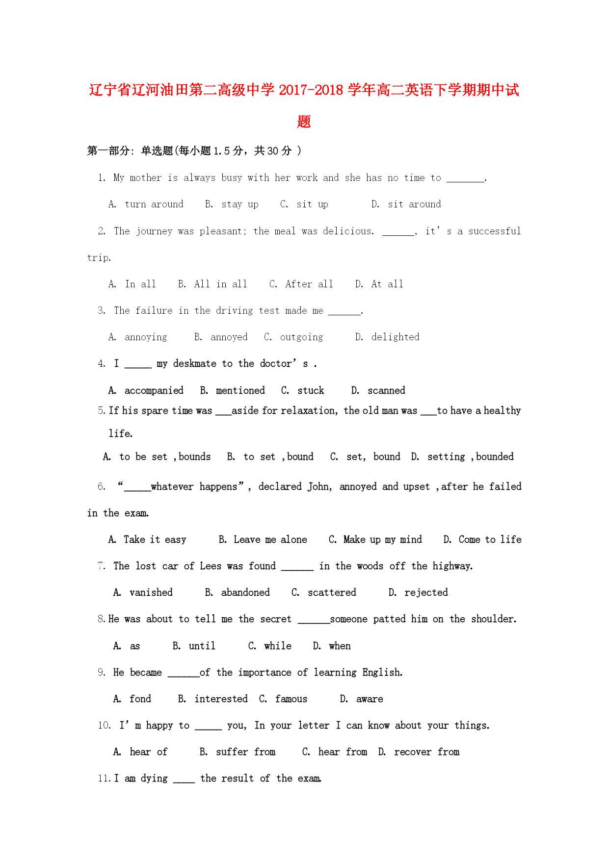 辽宁省辽河油田第二高级中学2017-2018学年高二英语下学期期中试题第一部分:单选题(每小题1.5分,共30分)1.Mymotherisalwaysbusywithherworkandshehasnotimeto_______.A.turnaroundB.stayupC.situpD.sitaround2.Thejourneywaspleasant;themealwasdelicious.______,it’sasuccessfultrip.A.InallB.AllinallC.AfterallD.At