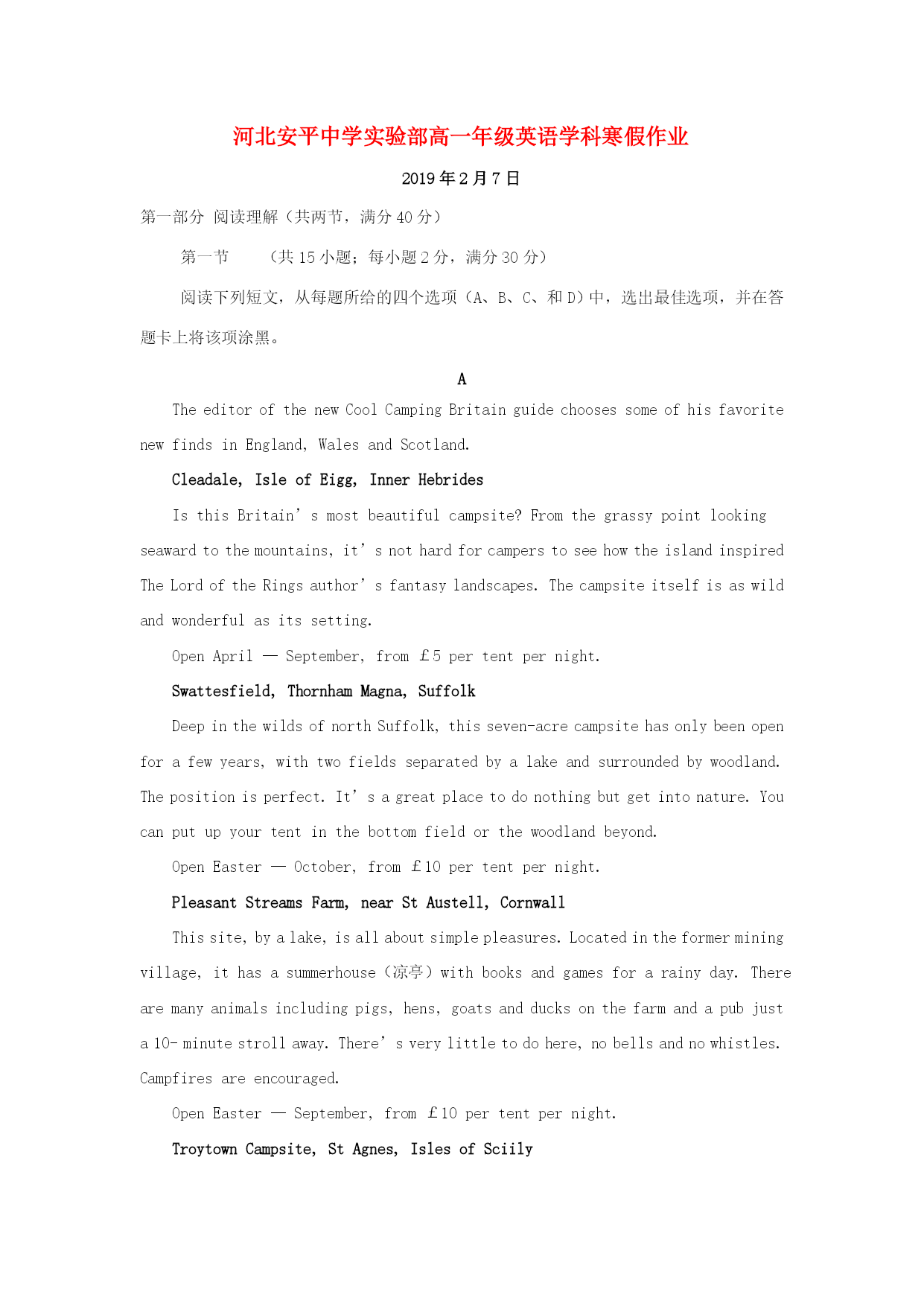 河北安平中学实验部高一年级英语学科寒假作业2019年2月7日第一部分阅读理解(共两节,满分40分)第一节(共15小题;每小题2分,满分30分)阅读下列短文,从每题所给的四个选项(A、B、C、和D)中,选出最佳选项,并在答题卡上将该项涂黑。ATheeditorofthenewCoolCampingBritainguidechoosessomeofhisfavoritenewfindsinEngland,WalesandScotland.Cleadale,IsleofEigg,InnerHebridesIst