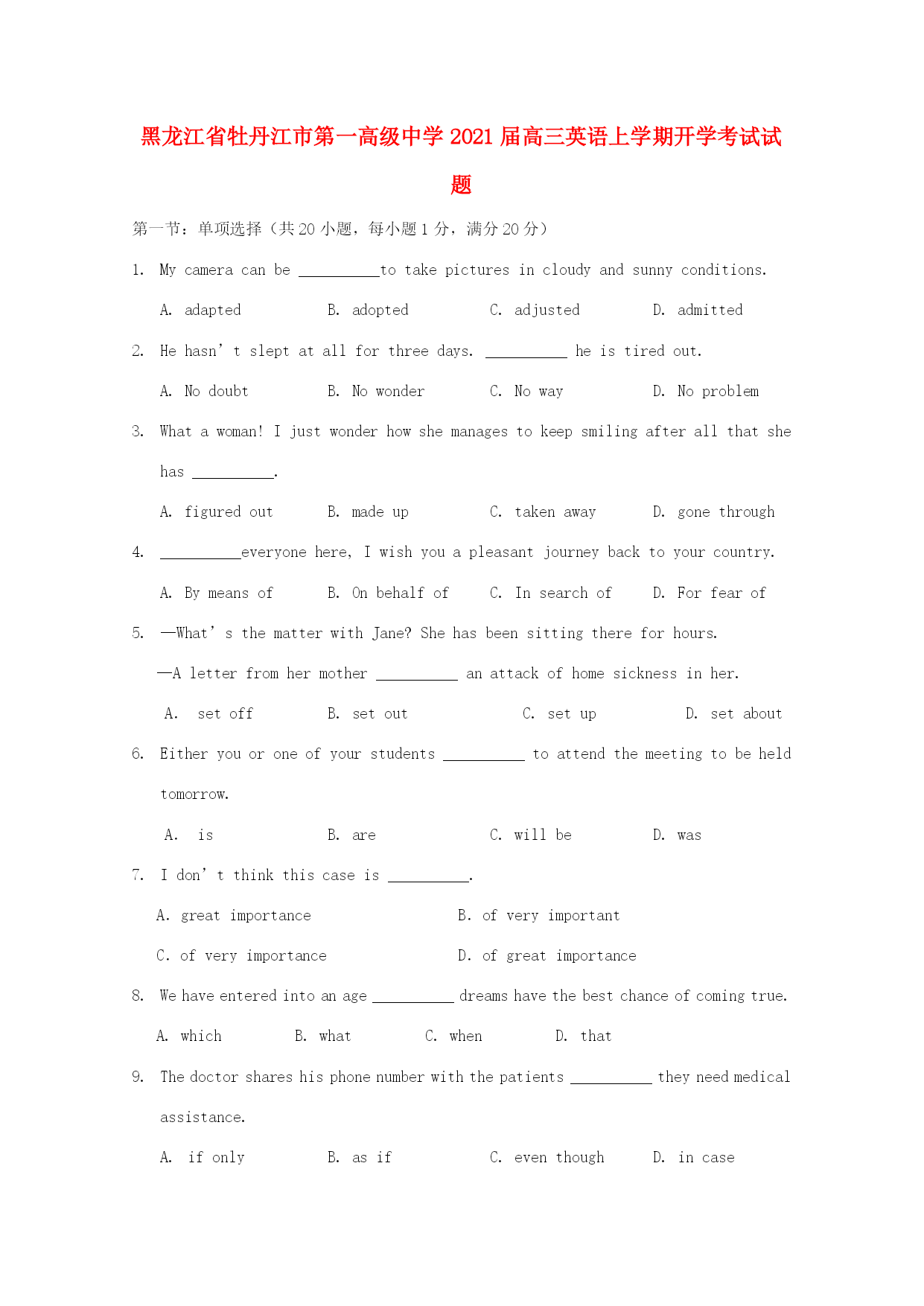 黑龙江省牡丹江市第一高级中学2021届高三英语上学期开学考试试题第一节:单项选择(共20小题,每小题1分,满分20分)Mycameracanbe__________totakepicturesincloudyandsunnyconditions.A.adaptedB.adoptedC.adjustedD.admittedHehasn’tsleptatallforthreedays.__________heistiredout.A.NodoubtB.NowonderC.NowayD.NoproblemWha