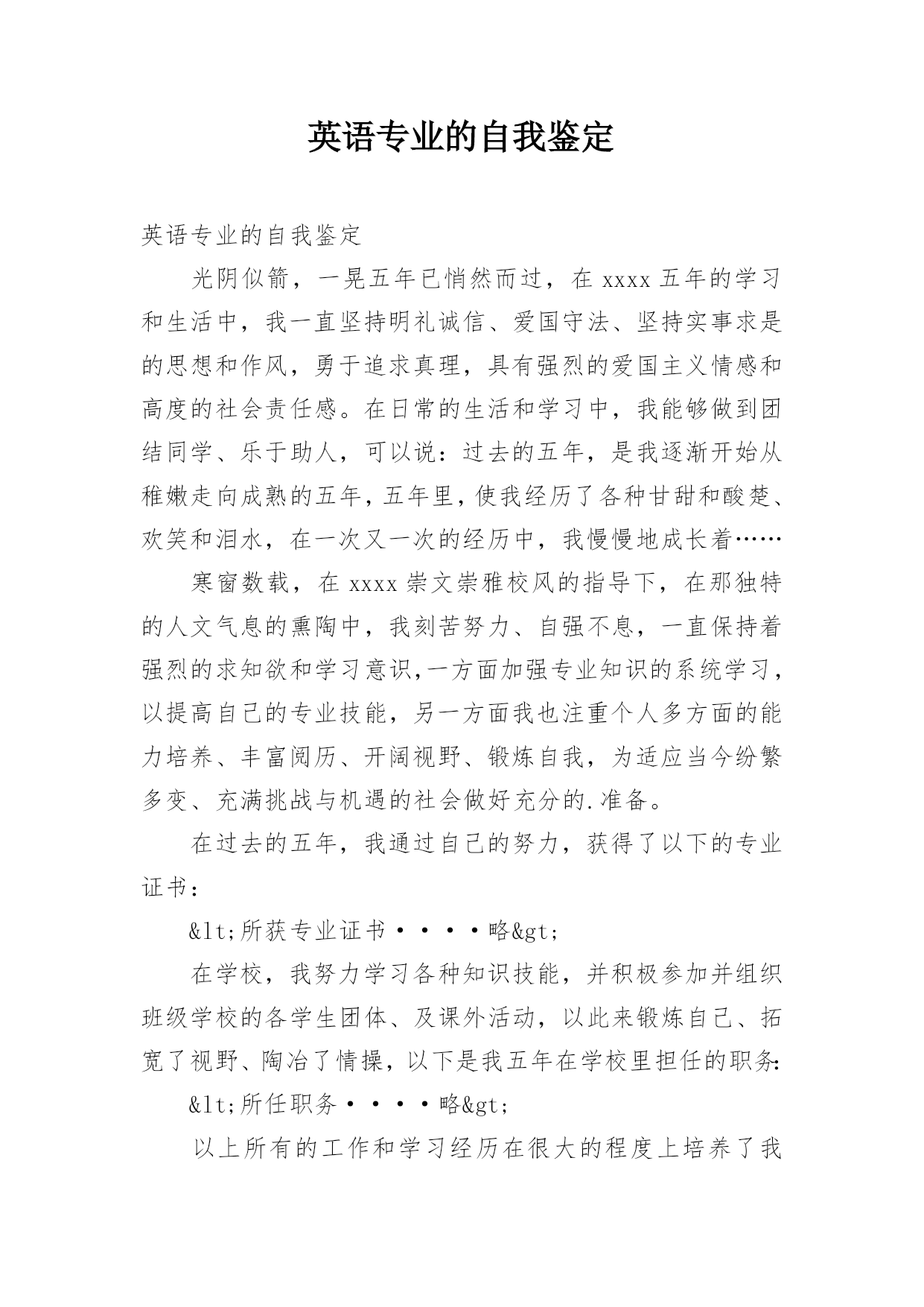 英语专业的自我鉴定英语专业的自我鉴定光阴似箭,一晃五年已悄然而过,在xxxx五年的学习和生活中,我一直坚持明礼诚信、爱国守法、坚持实事求是的思想和作风,勇于追求真理,具有强烈的爱国主义情感和高度的社会责任感。在日常的生活和学习中,我能够做到团结同学、乐于助人,可以说:过去的五年,是我逐渐开始从稚嫩走向成熟的五年,五年里,使我经历了各种甘甜和酸楚、欢笑和泪水,在一次又一次的经历中,我慢慢地成长着……寒窗数载,在xxxx崇文崇雅校风的指导下,在那独特的人文气息的熏陶中,我刻苦努力、自强不息,一直保持着强烈的求
