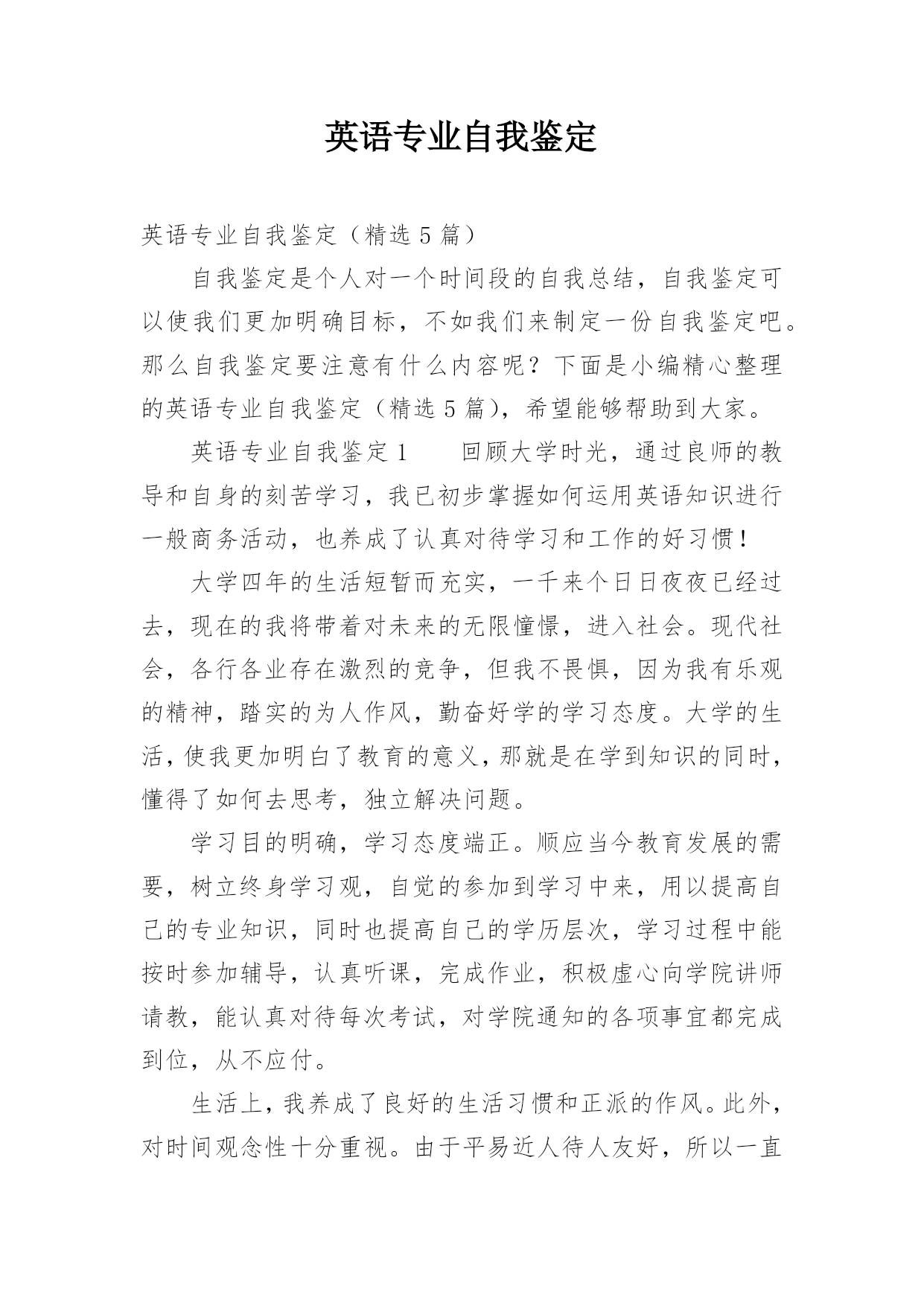 英语专业自我鉴定英语专业自我鉴定(精选5篇)自我鉴定是个人对一个时间段的自我总结,自我鉴定可以使我们更加明确目标,不如我们来制定一份自我鉴定吧。那么自我鉴定要注意有什么内容呢?下面是小编精心整理的英语专业自我鉴定(精选5篇),希望能够帮助到大家。英语专业自我鉴定1回顾大学时光,通过良师的教导和自身的刻苦学习,我已初步掌握如何运用英语知识进行一般商务活动,也养成了认真对待学习和工作的好习惯!大学四年的生活短暂而充实,一千来个日日夜夜已经过去,现在的我将带着对未来的无限憧憬,进入社会。现代社会,各行各业存在激