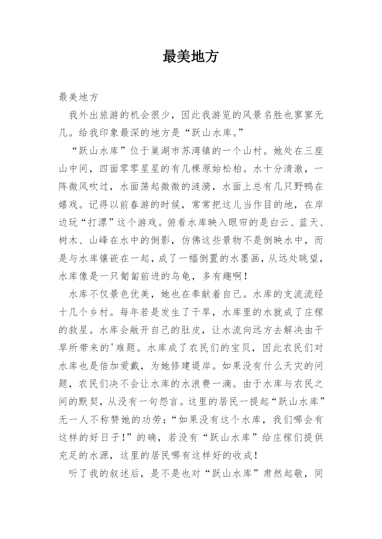最美地方最美地方我外出旅游的机会很少,因此我游览的风景名胜也寥寥无几。给我印象最深的地方是“跃山水库。”“跃山水库”位于巢湖市苏湾镇的一个山村。她处在三座山中间,四面零零星星的有几棵原始松柏。水十分清澈,一阵微风吹过,水面荡起微微的涟漪,水面上总有几只野鸭在嬉戏。记得以前春游的时候,常常把这儿当作目的地,在岸边玩“打漂”这个游戏。俯看水库映入眼帘的是白云、蓝天、树木、山峰在水中的倒影,仿佛这些景物不是倒映水中,而是与水库镶嵌在一起,成了一幅倒置的水墨画,从远处眺望,水库像是一只匍匐前进的乌龟,多有趣啊!水