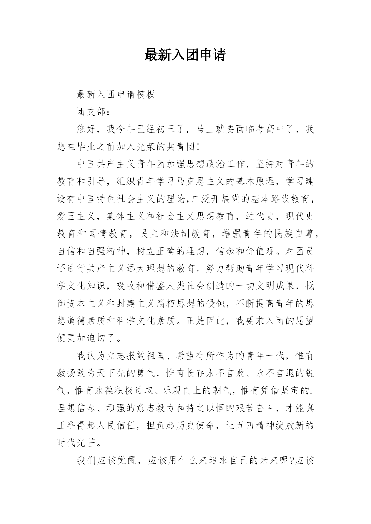 最新入团申请最新入团申请模板团支部:您好,我今年已经初三了,马上就要面临考高中了,我想在毕业之前加入光荣的共青团!中国共产主义青年团加强思想政治工作,坚持对青年的教育和引导,组织青年学习马克思主义的基本原理,学习建设有中国特色社会主义的理论,广泛开展党的基本路线教育,爱国主义,集体主义和社会主义思想教育,近代史,现代史教育和国情教育,民主和法制教育,增强青年的民族自尊,自信和自强精神,树立正确的理想,信念和价值观。对团员还进行共产主义远大理想的教育。努力帮助青年学习现代科学文化知识,吸收和借鉴人类社会创造