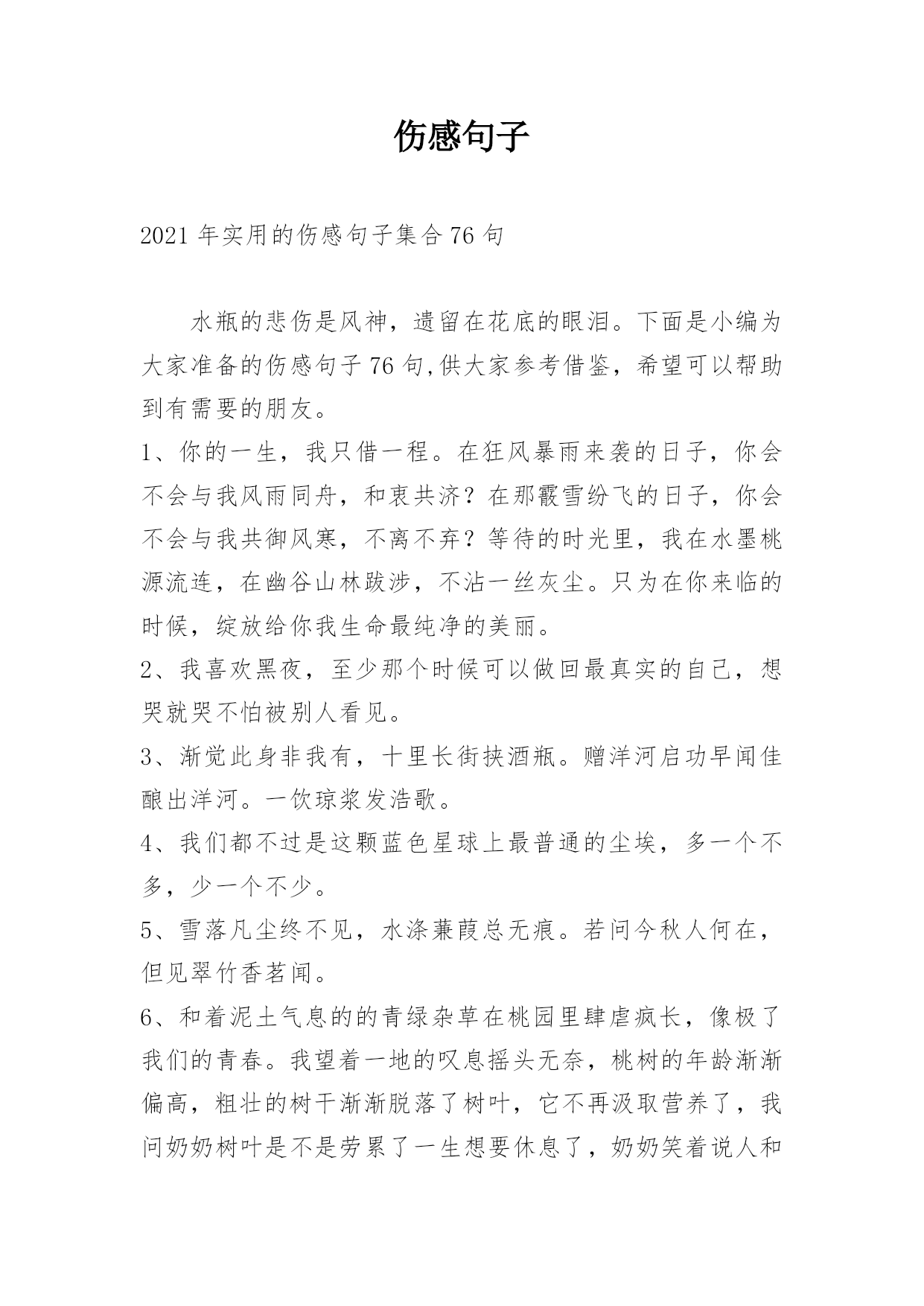 伤感句子2021年实用的伤感句子集合76句水瓶的悲伤是风神,遗留在花底的眼泪。下面是小编为大家准备的伤感句子76句,供大家参考借鉴,希望可以帮助到有需要的朋友。1、你的一生,我只借一程。在狂风暴雨来袭的日子,你会不会与我风雨同舟,和衷共济?在那霰雪纷飞的日子,你会不会与我共御风寒,不离不弃?等待的时光里,我在水墨桃源流连,在幽谷山林跋涉,不沾一丝灰尘。只为在你来临的时候,绽放给你我生命最纯净的美丽。2、我喜欢黑夜,至少那个时候可以做回最真实的自己,想哭就哭不怕被别人看见。3、渐觉此身非我有,十里长街挟酒瓶