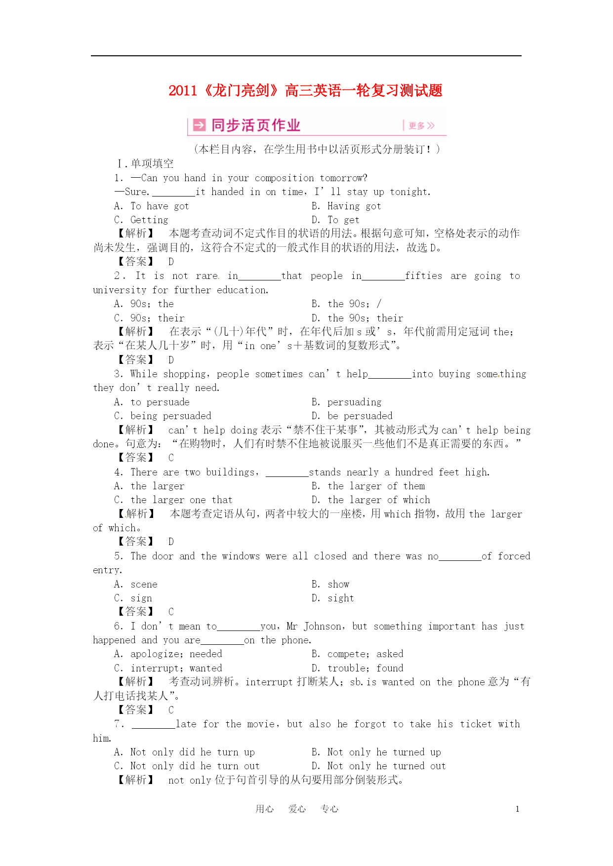 用心爱心专心2011《龙门亮剑》高三英语一轮复习测试题(本栏目内容,在学生用书中以活页形式分册装订!)Ⅰ.单项填空1.—Canyouhandinyourcompositiontomorrow?—Sure.________ithandedinontime,I’llstayuptonight.A.TohavegotB.HavinggotC.GettingD.Toget【解析】本题考查动词不定式作目的状语的用法。根据句意可知,空格处表示的动作尚未发生,强调目的,这符合不定式的一般式作目的状语的用法,故选D。【答