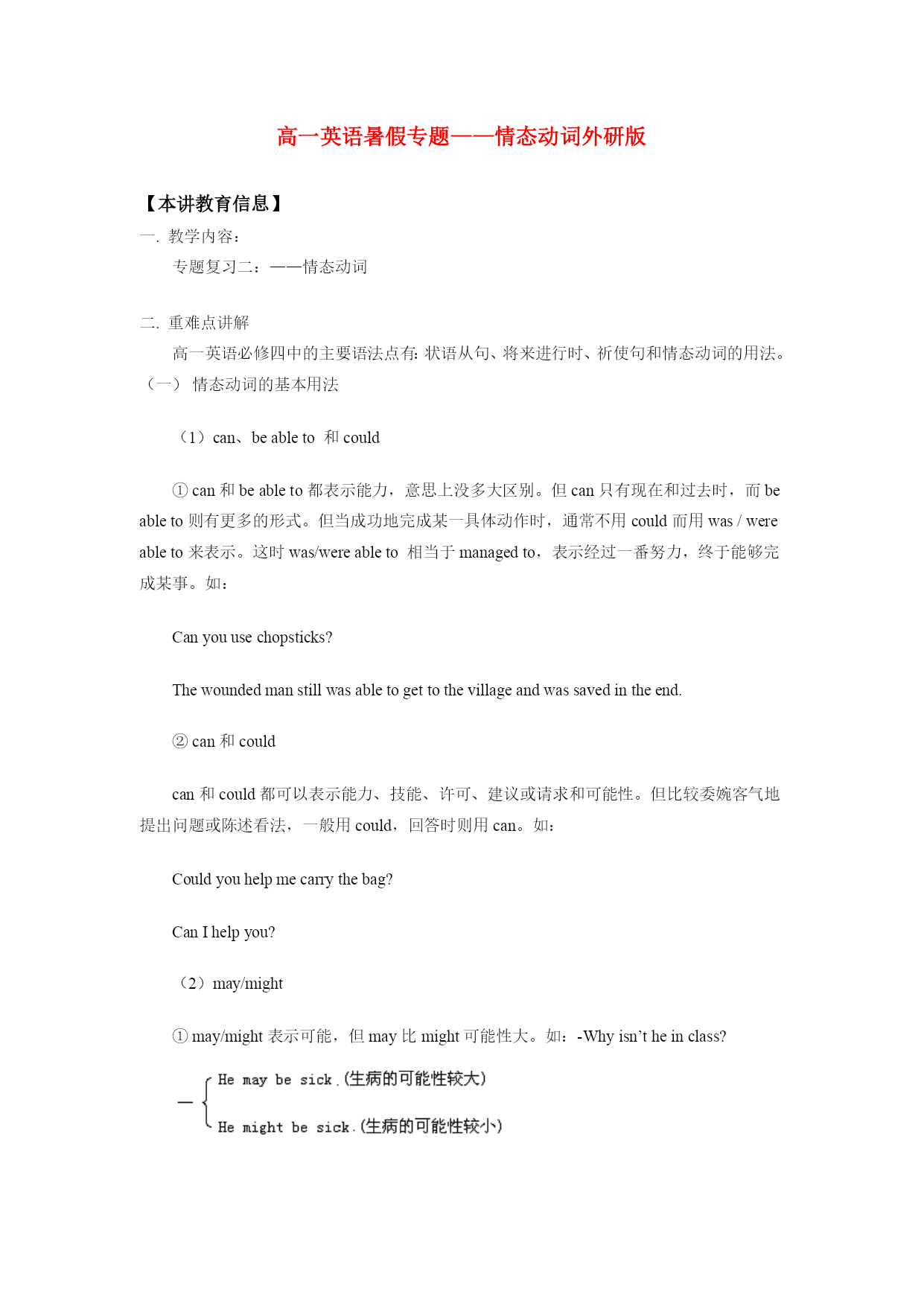 高一英语暑假专题——情态动词外研版【本讲教育信息】一.教学内容:专题复习二:——情态动词二.重难点讲解高一英语必修四中的主要语法点有:状语从句、将来进行时、祈使句和情态动词的用法。(一)情态动词的基本用法(1)can、beableto和could①can和beableto都表示能力,意思上没多大区别。但can只有现在和过去时,而beableto则有更多的形式。但当成功地完成某一具体动作时,通常不用could而用was/wereableto来表示。这时was/wereableto相当于managedto,表