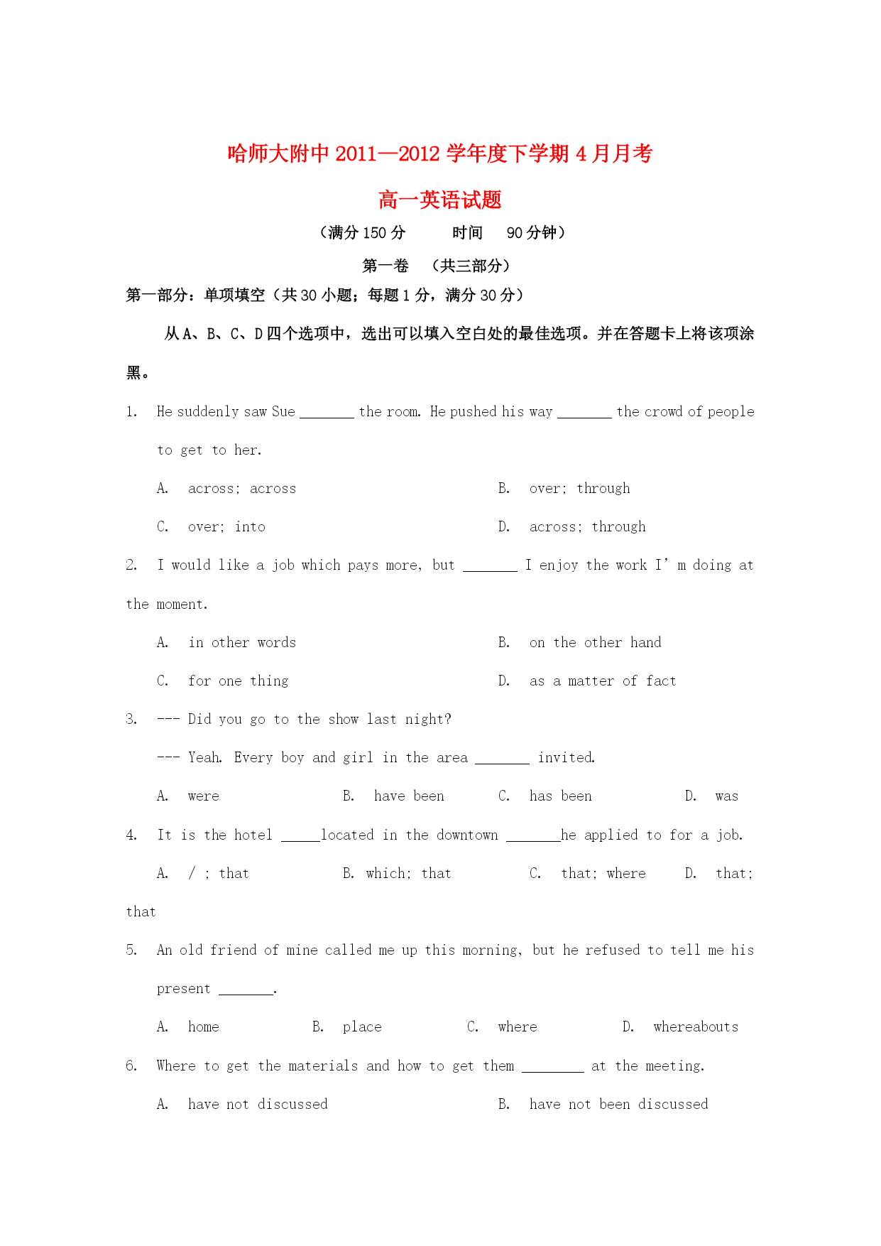 哈师大附中2011—2012学年度下学期4月月考高一英语试题(满分150分时间90分钟)第一卷(共三部分)第一部分:单项填空(共30小题;每题1分,满分30分)从A、B、C、D四个选项中,选出可以填入空白处的最佳选项。并在答题卡上将该项涂黑。1.HesuddenlysawSue_______theroom.Hepushedhisway_______thecrowdofpeopletogettoher.A.across;acrossB.over;throughC.over;intoD.across;thro