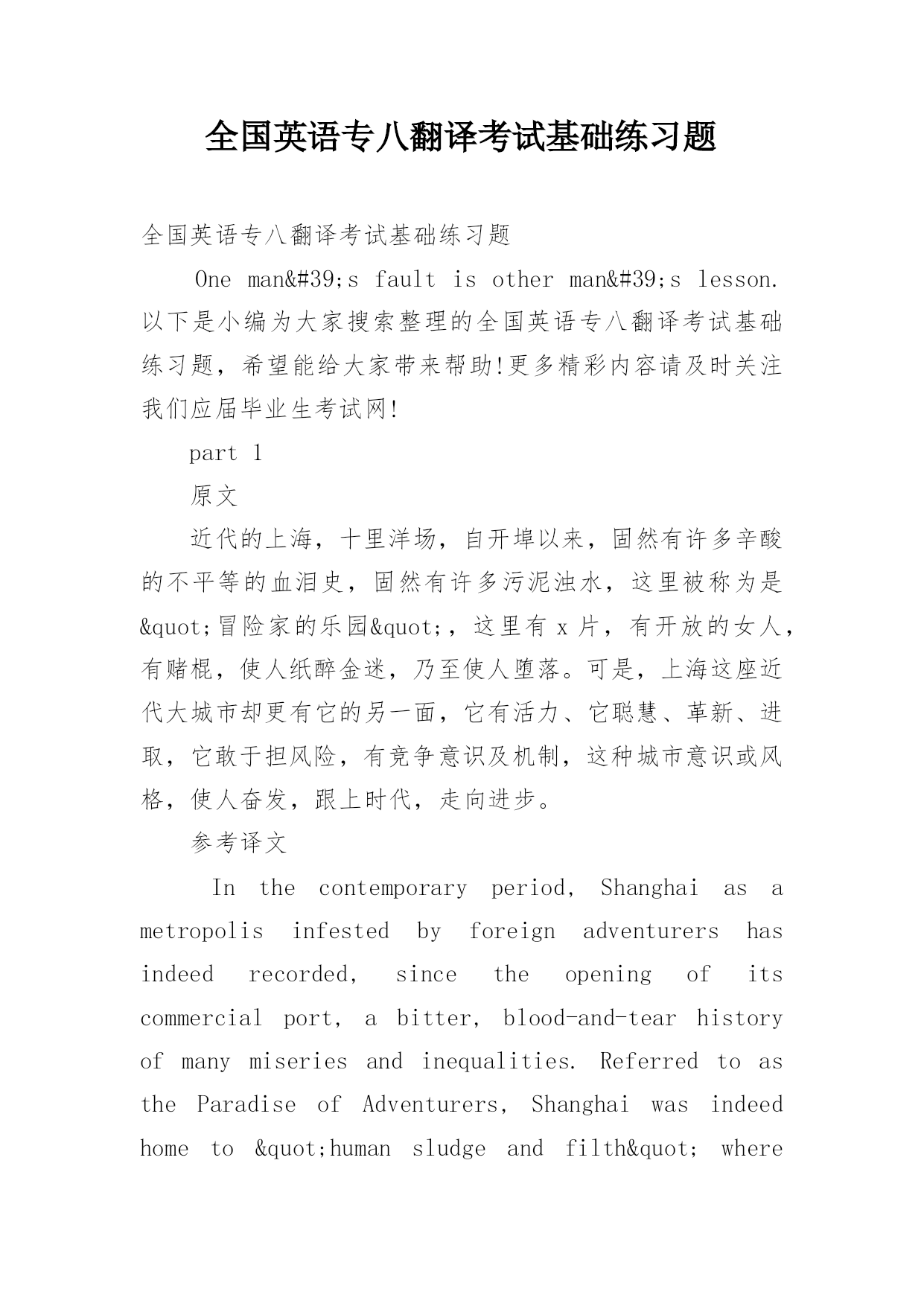 全国英语专八翻译考试基础练习题全国英语专八翻译考试基础练习题Oneman'sfaultisotherman'slesson.以下是小编为大家搜索整理的全国英语专八翻译考试基础练习题,希望能给大家带来帮助!更多精彩内容请及时关注我们应届毕业生考试网!part1原文近代的上海,十里洋场,自开埠以来,固然有许多辛酸的不平等的血泪史,固然有许多污泥浊水,这里被称为是"冒险家的乐园",这里有x片,有开放的女人,有赌棍,使人纸醉金迷,乃至使人堕落。可是,上海这座近代大城市却更有它的