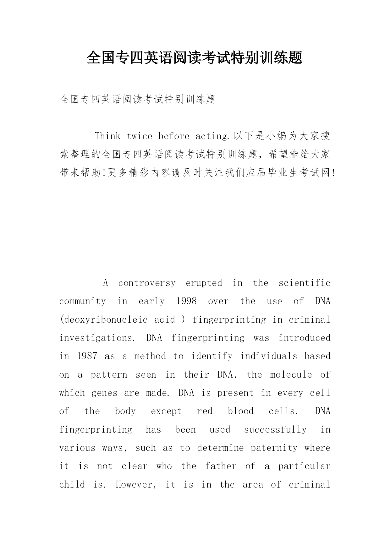 全国专四英语阅读考试特别训练题全国专四英语阅读考试特别训练题Thinktwicebeforeacting.以下是小编为大家搜索整理的全国专四英语阅读考试特别训练题,希望能给大家带来帮助!更多精彩内容请及时关注我们应届毕业生考试网!Acontroversyeruptedinthescientificcommunityinearly1998overtheuseofDNA(deoxyribonucleicacid)fingerprintingincriminalinvestigations.DNAfingerp
