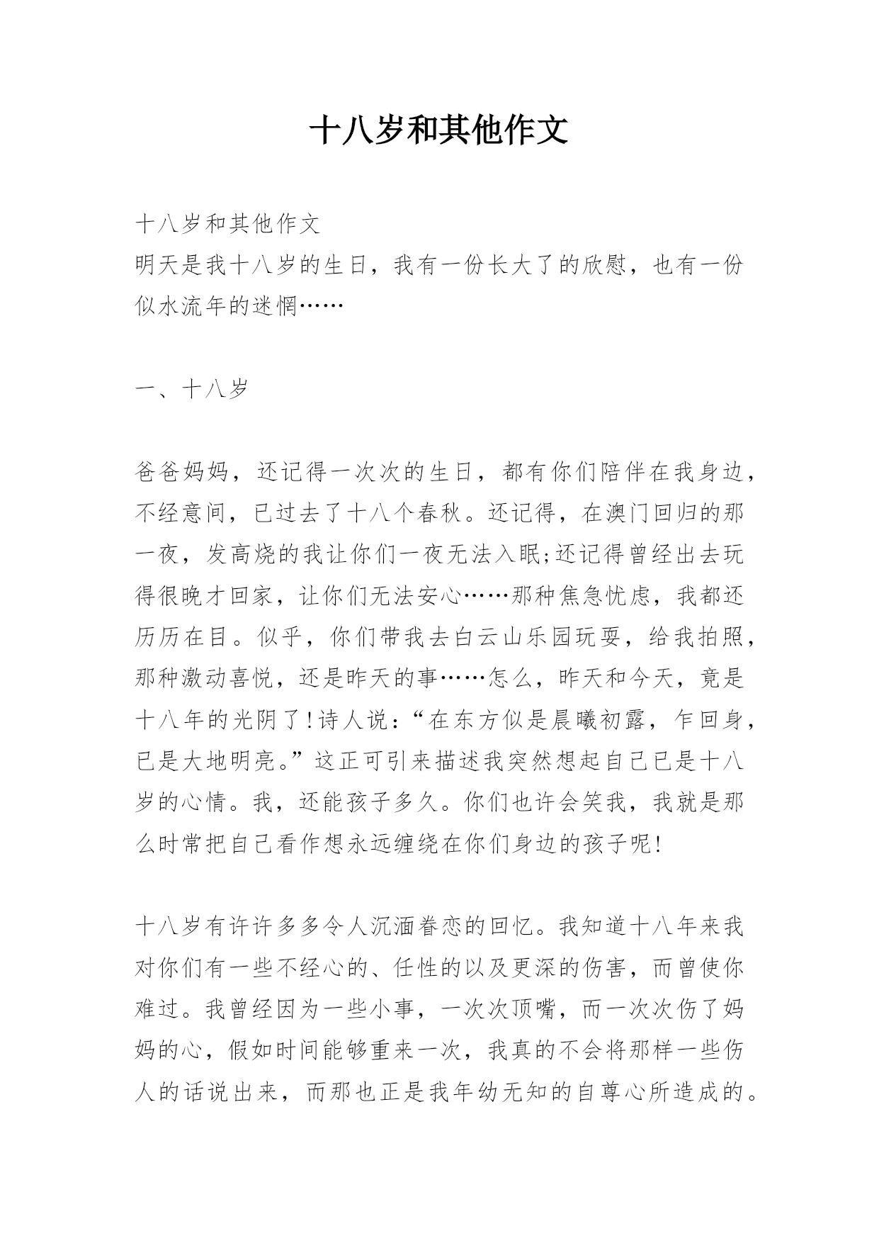 十八岁和其他作文十八岁和其他作文明天是我十八岁的生日,我有一份长大了的欣慰,也有一份似水流年的迷惘……一、十八岁爸爸妈妈,还记得一次次的生日,都有你们陪伴在我身边,不经意间,已过去了十八个春秋。还记得,在澳门回归的那一夜,发高烧的我让你们一夜无法入眠;还记得曾经出去玩得很晚才回家,让你们无法安心……那种焦急忧虑,我都还历历在目。似乎,你们带我去白云山乐园玩耍,给我拍照,那种激动喜悦,还是昨天的事……怎么,昨天和今天,竟是十八年的光阴了!诗人说:“在东方似是晨曦初露,乍回身,已是大地明亮。”这正可引来描述我