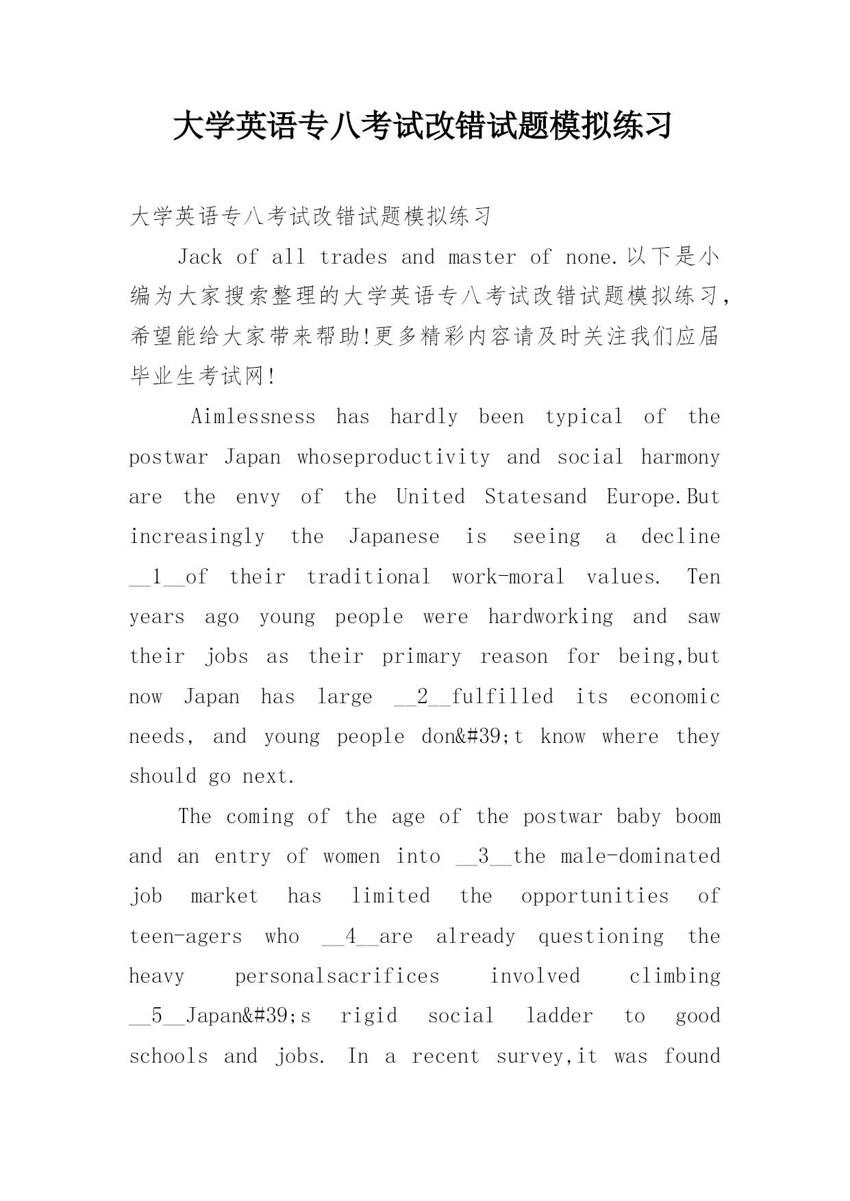 大学英语专八考试改错试题模拟练习大学英语专八考试改错试题模拟练习Jackofalltradesandmasterofnone.以下是小编为大家搜索整理的大学英语专八考试改错试题模拟练习,希望能给大家带来帮助!更多精彩内容请及时关注我们应届毕业生考试网!AimlessnesshashardlybeentypicalofthepostwarJapanwhoseproductivityandsocialharmonyaretheenvyoftheUnitedStatesandEurope.Butincreasi