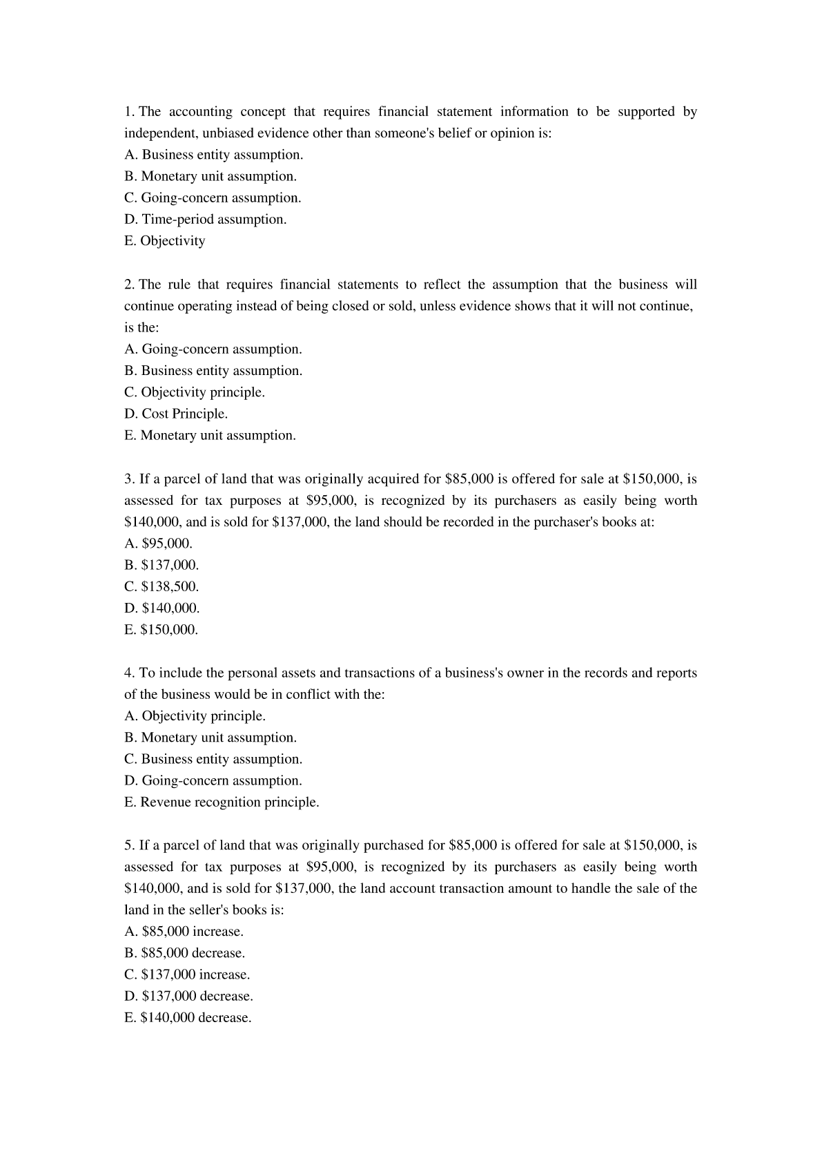 1.Theaccountingconceptthatrequiresfinancialstatementinformationtobesupportedbyindependent,unbiasedevidenceotherthansomeone'sbelieforopinionis:A.Businessentityassumption.B.Monetaryunitassumption.C.Going-concernassumption.D.Time-periodassumption.E.Objectivi