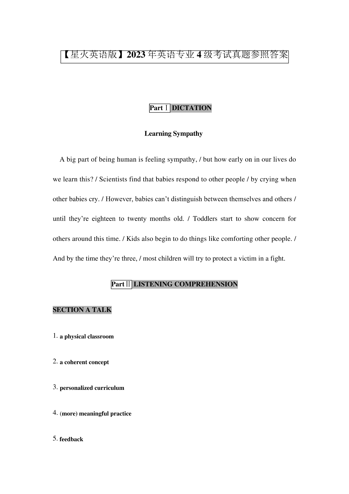 【星火英语版】2023年英语专业4级考试真题参照答案PartⅠDICTATIONLearningSympathyAbigpartofbeinghumanisfeelingsympathy,/buthowearlyoninourlivesdowelearnthis?/Scientistsfindthatbabiesrespondtootherpeople/bycryingwhenotherbabiescry./However,babiescan’tdistinguishbetweenthemselvesan