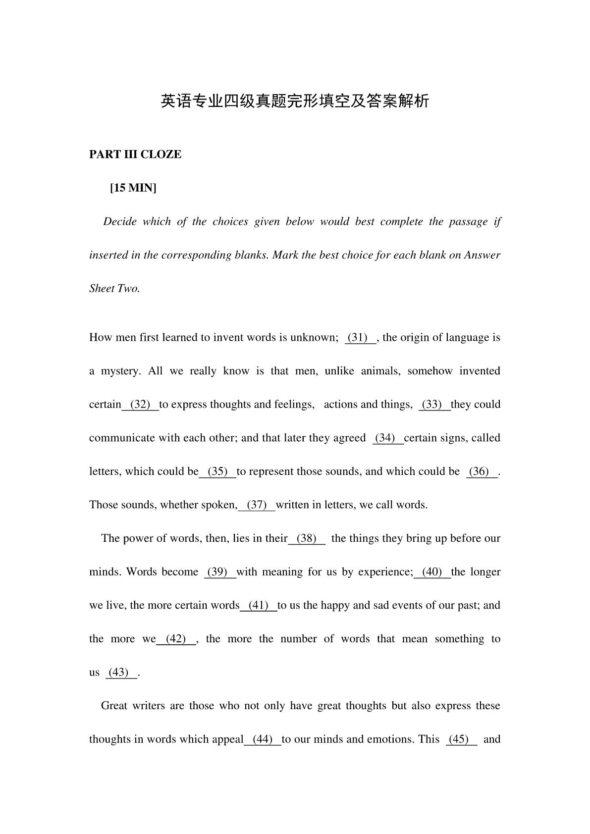 英语专业四级真题完形填空及答案解析PARTIIICLOZE[15MIN]Decidewhichofthechoicesgivenbelowwouldbestcompletethepassageifinsertedinthecorrespondingblanks.MarkthebestchoiceforeachblankonAnswerSheetTwo.Howmenfirstlearnedtoinventwordsisunknown;(31),theoriginoflanguageisamystery.Al