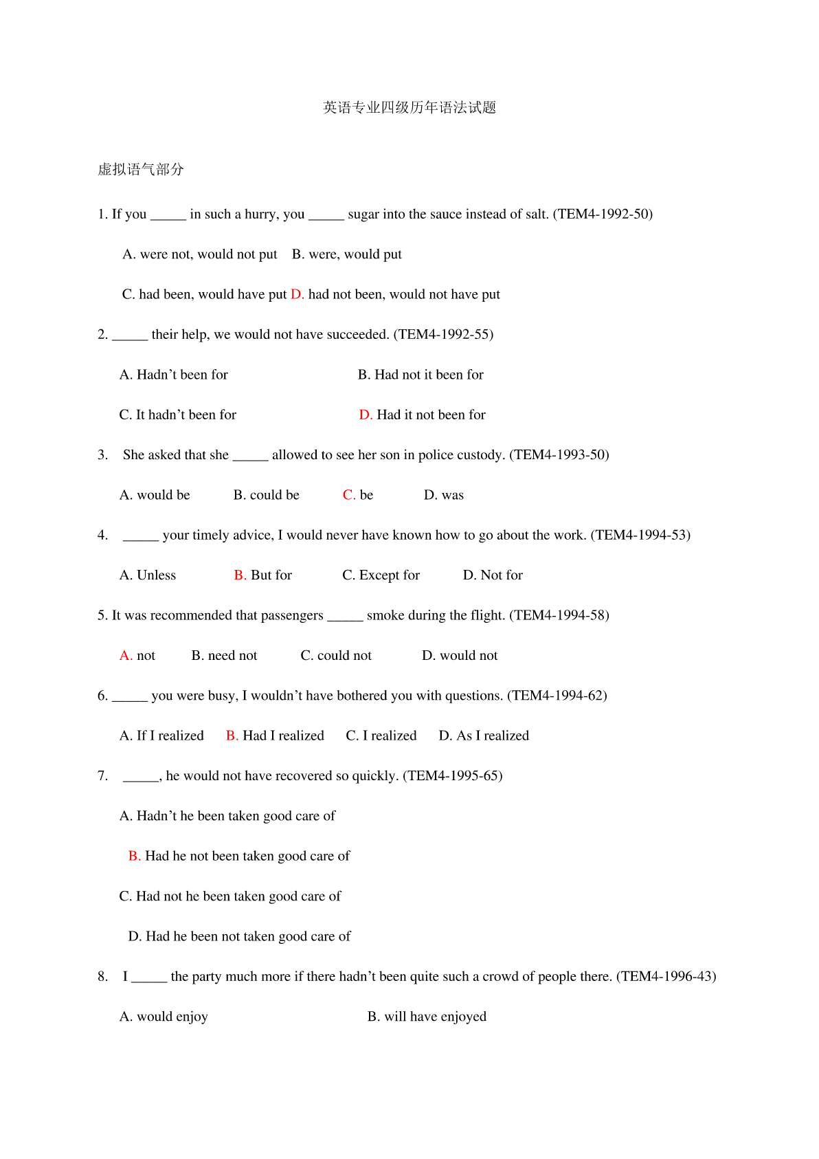 英语专业四级历年语法试题虚拟语气部分1.Ifyou_____insuchahurry,you_____sugarintothesauceinsteadofsalt.(TEM4-1992-50)A.werenot,wouldnotputB.were,wouldputC.hadbeen,wouldhaveputD.hadnotbeen,wouldnothaveput2._____theirhelp,wewouldnothavesucceeded.(TEM4-1992-55)A.Hadn’tbeenforB.H