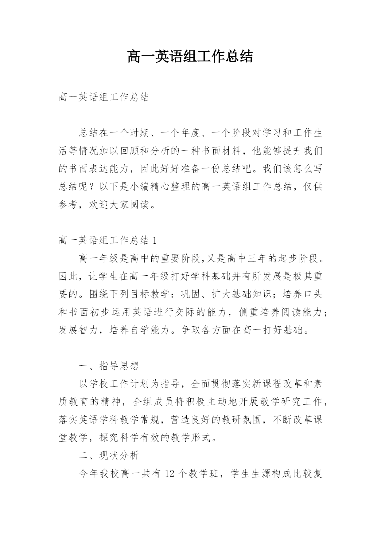 高一英语组工作总结高一英语组工作总结总结在一个时期、一个年度、一个阶段对学习和工作生活等情况加以回顾和分析的一种书面材料,他能够提升我们的书面表达能力,因此好好准备一份总结吧。我们该怎么写总结呢?以下是小编精心整理的高一英语组工作总结,仅供参考,欢迎大家阅读。高一英语组工作总结1高一年级是高中的重要阶段,又是高中三年的起步阶段。因此,让学生在高一年级打好学科基础并有所发展是极其重要的。围绕下列目标教学:巩固、扩大基础知识;培养口头和书面初步运用英语进行交际的能力,侧重培养阅读能力;发展智力,培养自学能力。