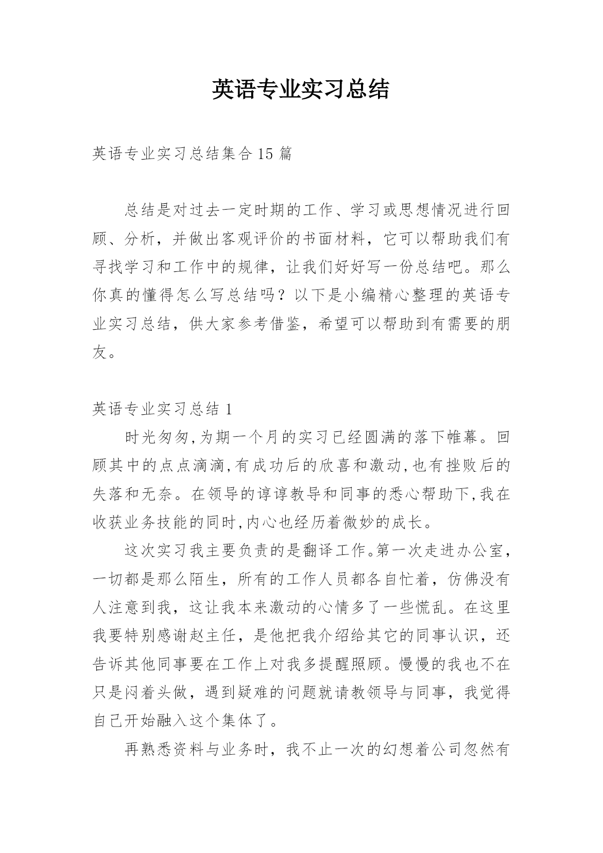 英语专业实习总结英语专业实习总结(精选15篇)总结就是把一个时段的学习、工作或其完成情况进行一次全面系统的总结,它可以提升我们发现问题的能力,因此我们要做好归纳,写好总结。总结一般是怎么写的呢?下面是小编为大家整理的英语专业实习总结,仅供参考,希望能够帮助到大家。英语专业实习总结1经过两个月的实习,我收获了很多,也懂得了许多,同时也成熟了不少。下面我将把我两个月的实习生活分成五个部分进行总结:教学经验、班主任工作、做事态度、学生友谊、感恩的心。教学经验:如何上好一个普通班的课?普通班的学生其实可分为几个类