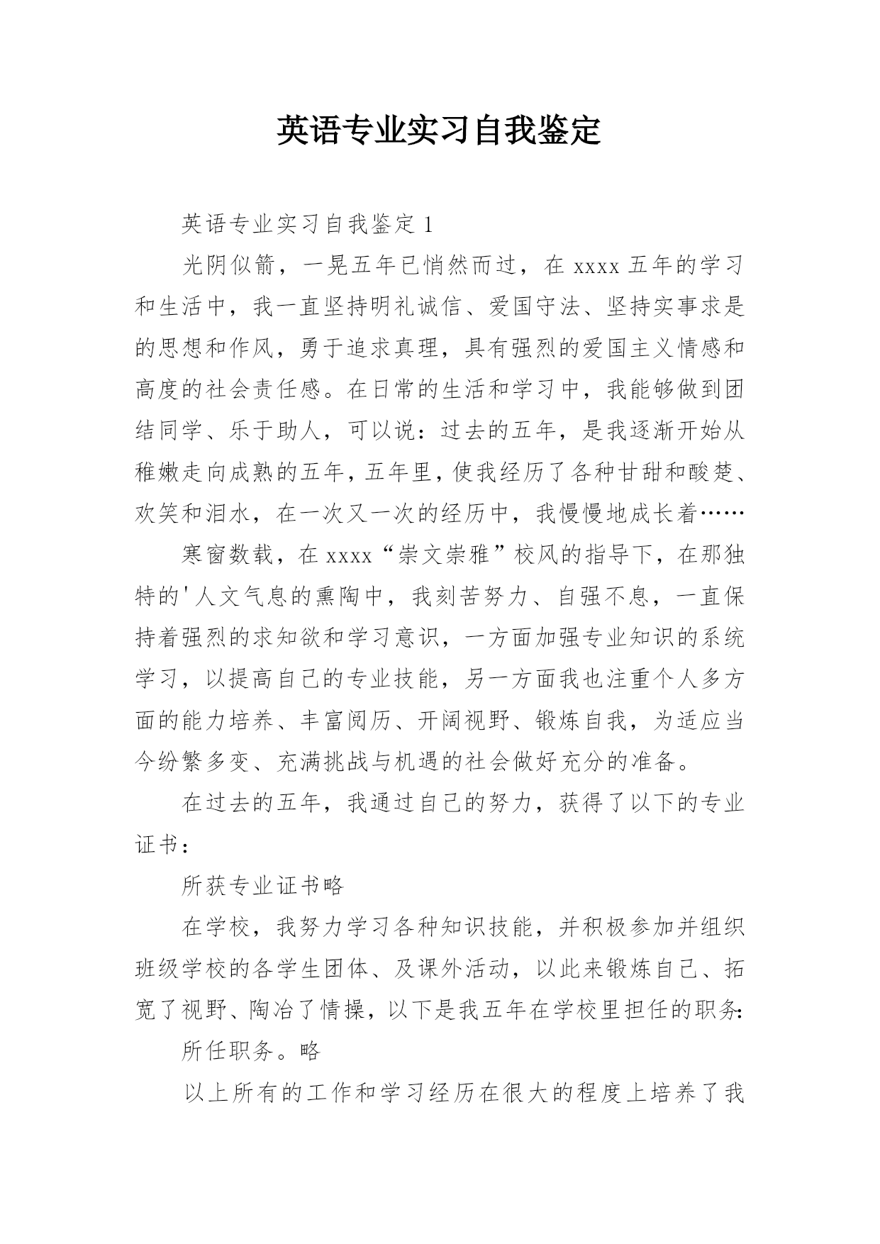 英语专业实习自我鉴定英语专业实习自我鉴定1光阴似箭,一晃五年已悄然而过,在xxxx五年的学习和生活中,我一直坚持明礼诚信、爱国守法、坚持实事求是的思想和作风,勇于追求真理,具有强烈的爱国主义情感和高度的社会责任感。在日常的生活和学习中,我能够做到团结同学、乐于助人,可以说:过去的五年,是我逐渐开始从稚嫩走向成熟的五年,五年里,使我经历了各种甘甜和酸楚、欢笑和泪水,在一次又一次的经历中,我慢慢地成长着……寒窗数载,在xxxx“崇文崇雅”校风的指导下,在那独特的'人文气息的熏陶中,我刻苦努力、自强不息,一直保
