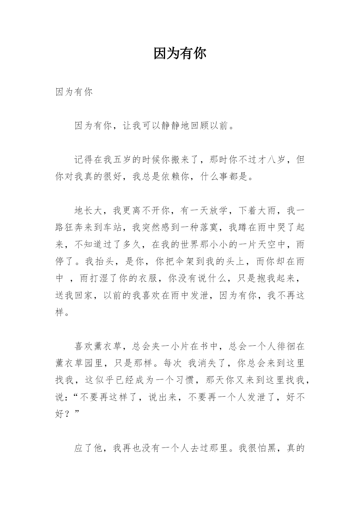因为有你因为有你因为有你,让我可以静静地回顾以前。记得在我五岁的时候你搬来了,那时你不过才八岁,但你对我真的很好,我总是依赖你,什么事都是。地长大,我更离不开你,有一天放学,下着大雨,我一路狂奔来到车站,我突然感到一种落寞,我蹲在雨中哭了起来,不知道过了多久,在我的世界那小小的一片天空中,雨停了。我抬头,是你,你把伞架到我的头上,而你却在雨中,雨打湿了你的衣服,你没有说什么,只是抱我起来,送我回家,以前的我喜欢在雨中发泄,因为有你,我不再这样。喜欢薰衣草,总会夹一小片在书中,总会一个人徘徊在薰衣草园里,只