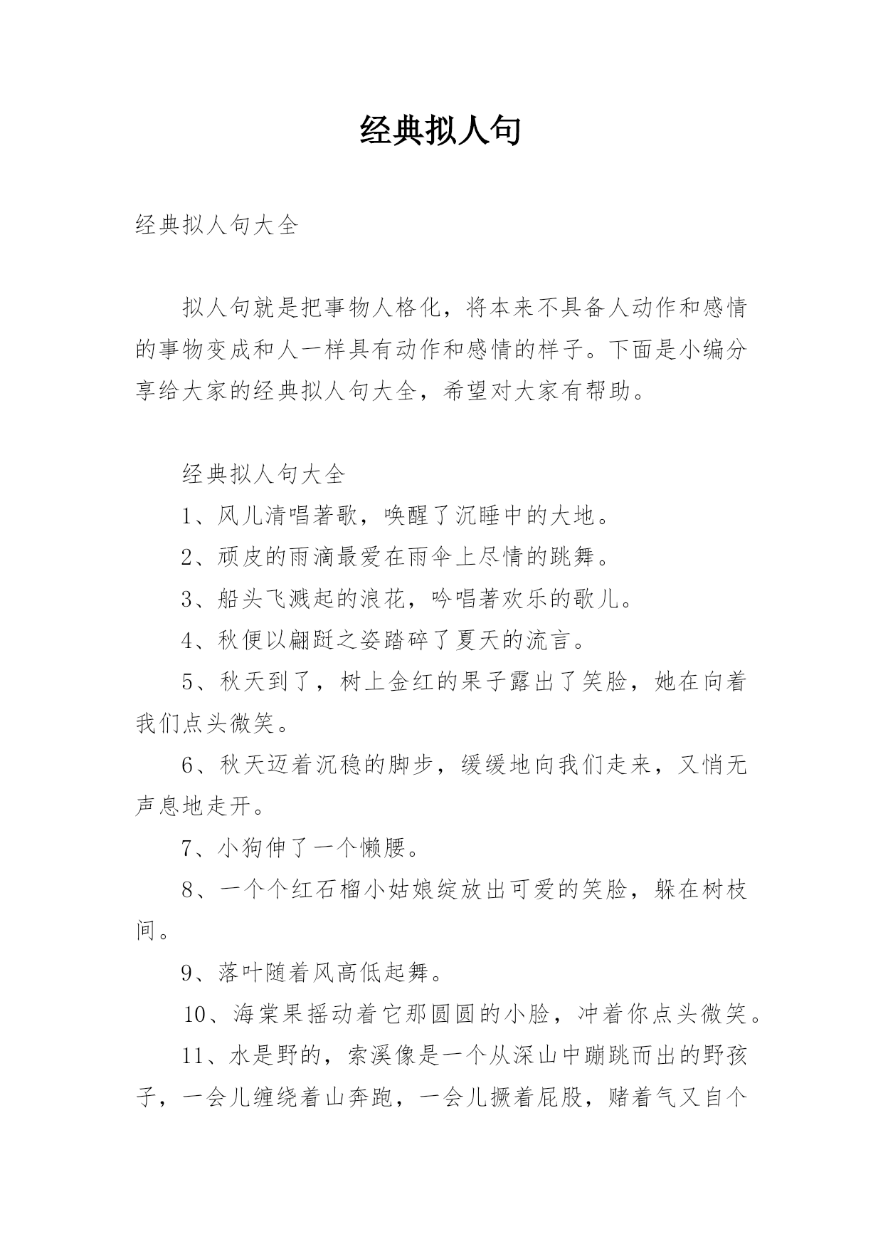 经典拟人句经典拟人句大全拟人句就是把事物人格化,将本来不具备人动作和感情的事物变成和人一样具有动作和感情的样子。下面是小编分享给大家的经典拟人句大全,希望对大家有帮助。经典拟人句大全1、风儿清唱著歌,唤醒了沉睡中的大地。2、顽皮的雨滴最爱在雨伞上尽情的跳舞。3、船头飞溅起的浪花,吟唱著欢乐的歌儿。4、秋便以翩跹之姿踏碎了夏天的流言。5、秋天到了,树上金红的果子露出了笑脸,她在向着我们点头微笑。6、秋天迈着沉稳的脚步,缓缓地向我们走来,又悄无声息地走开。7、小狗伸了一个懒腰。8、一个个红石榴小姑娘绽放出可爱