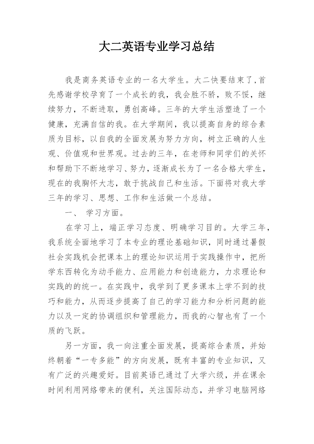 大二英语专业学习总结我是商务英语专业的一名大学生。大二快要结束了,首先感谢学校孕育了一个成长的我,我会胜不骄,败不馁,继续努力,不断进取,勇创高峰。三年的大学生活塑造了一个健康,充满自信的我。在大学期间,我以提高自身的综合素质为目标,以自我的全面发展为努力方向,树立正确的人生观、价值观和世界观。过去的三年,在老师和同学们的关怀和帮助下不断地学习、努力,逐渐成长为了一名合格大学生,现在的我胸怀大志,敢于挑战自己和生活。下面将对我大学三年的学习、思想、工作和生活做一个总结。一、学习方面。在学习上,端正学习态度