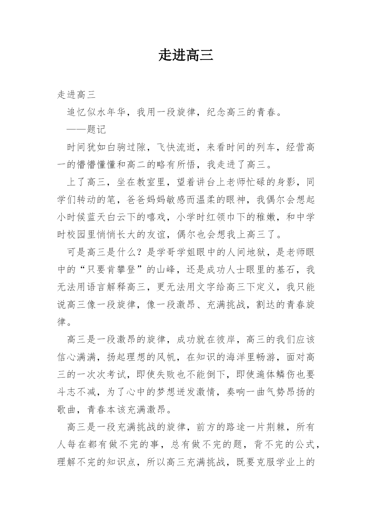 走进高三走进高三追忆似水年华,我用一段旋律,纪念高三的青春。——题记时间犹如白驹过隙,飞快流逝,来看时间的列车,经营高一的懵懵懂懂和高二的略有所悟,我走进了高三。上了高三,坐在教室里,望着讲台上老师忙碌的身影,同学们转动的笔,爸爸妈妈敏感而温柔的眼神,我偶尔会想起小时候蓝天白云下的嘻戏,小学时红领巾下的稚嫩,和中学时校园里悄悄长大的友谊,偶尔也会想我上高三了。可是高三是什么?是学哥学姐眼中的人间地狱,是老师眼中的“只要肯攀登”的山峰,还是成功人士眼里的基石,我无法用语言解释高三,更无法用文字给高三下定义,
