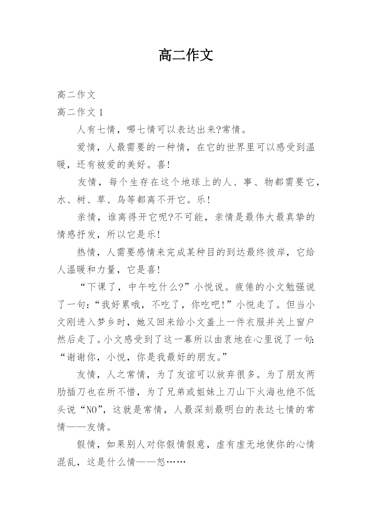 高二作文高二作文高二作文1人有七情,哪七情可以表达出来?常情。爱情,人最需要的一种情,在它的世界里可以感受到温暖,还有被爱的美好。喜!友情,每个生存在这个地球上的人、事、物都需要它,水、树、草、鸟等都离不开它。乐!亲情,谁离得开它呢?不可能,亲情是最伟大最真挚的情感抒发,所以它是乐!热情,人需要感情来完成某种目的到达最终彼岸,它给人温暖和力量,它是喜!“下课了,中午吃什么?”小悦说。疲倦的小文勉强说了一句:“我好累哦,不吃了,你吃吧!”小悦走了。但当小文刚进入梦乡时,她又回来给小文盖上一件衣服并关上窗户然