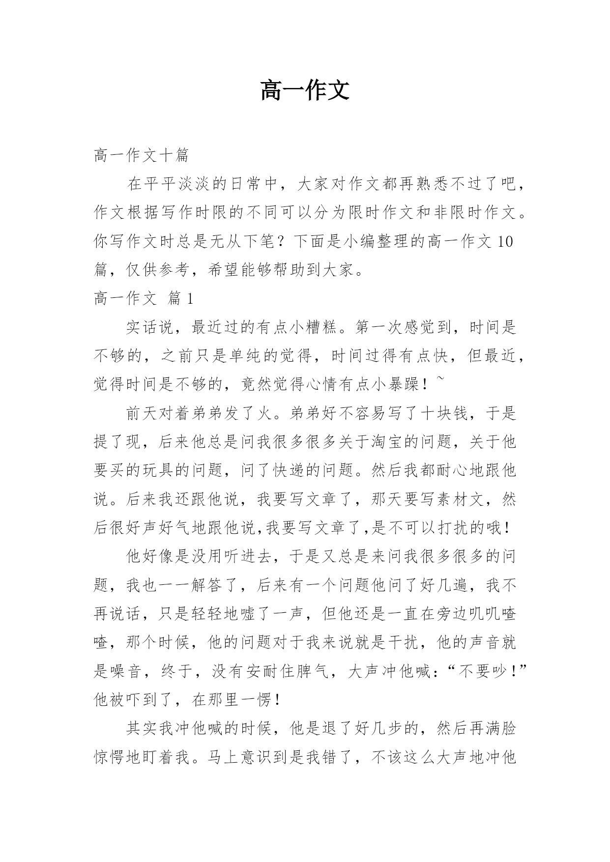 高一作文高一作文十篇在平平淡淡的日常中,大家对作文都再熟悉不过了吧,作文根据写作时限的不同可以分为限时作文和非限时作文。你写作文时总是无从下笔?下面是小编整理的高一作文10篇,仅供参考,希望能够帮助到大家。高一作文篇1实话说,最近过的有点小糟糕。第一次感觉到,时间是不够的,之前只是单纯的觉得,时间过得有点快,但最近,觉得时间是不够的,竟然觉得心情有点小暴躁!~前天对着弟弟发了火。弟弟好不容易写了十块钱,于是提了现,后来他总是问我很多很多关于淘宝的问题,关于他要买的玩具的问题,问了快递的问题。然后我都耐心地