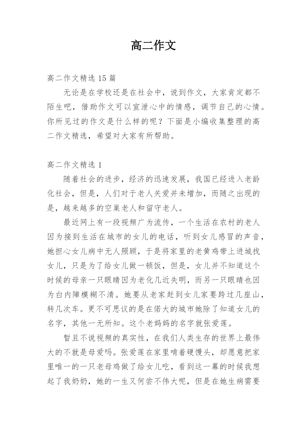 高二作文高二作文精选15篇无论是在学校还是在社会中,说到作文,大家肯定都不陌生吧,借助作文可以宣泄心中的情感,调节自己的心情。你所见过的作文是什么样的呢?下面是小编收集整理的高二作文精选,希望对大家有所帮助。高二作文精选1随着社会的进步,经济的迅速发展,我国已经进入老龄化社会,但是,人们对于老人关爱并未增加,而随之出现的是,越来越多的空巢老人和留守老人。最近网上有一段视频广为流传,一个生活在农村的老人因为接到生活在城市的女儿的电话,听到女儿感冒的声音,她担心女儿病中无人照顾,于是将家里的老黄鸡带上进城找女